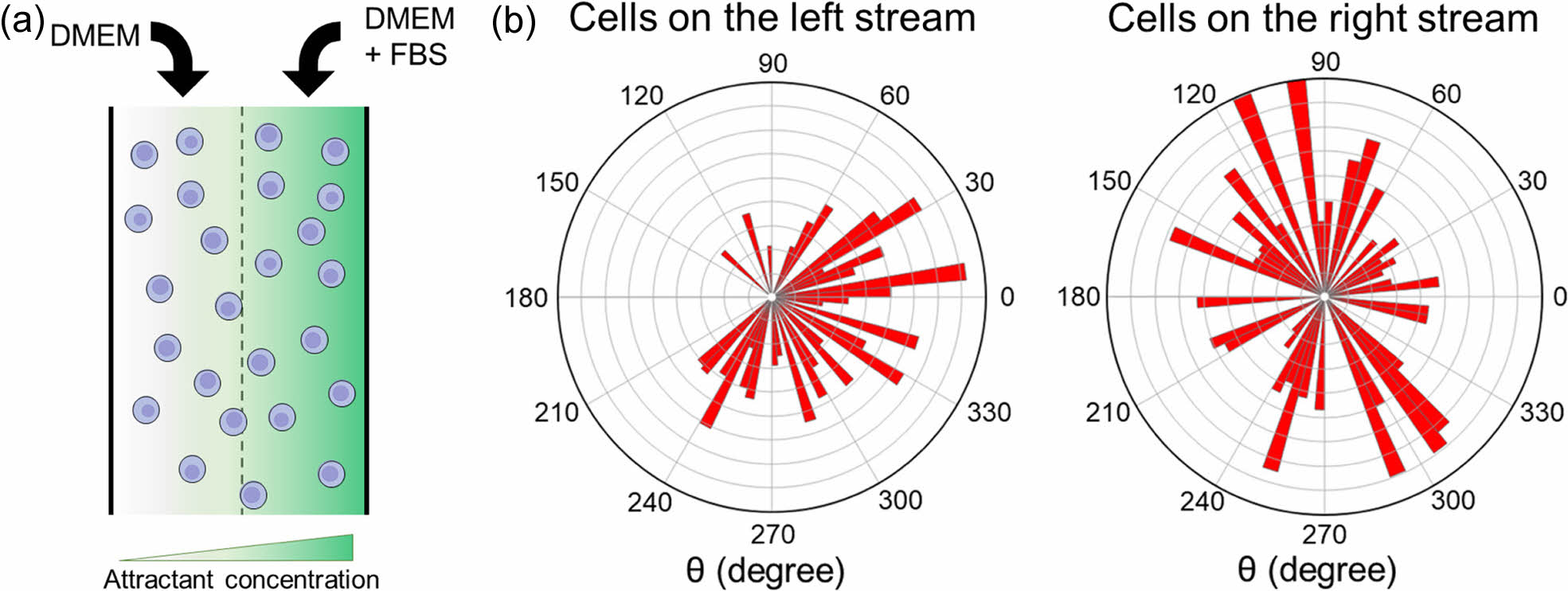 Cells are directed by a variety of chemical signals (i.e., chemokine signaling). These chemical signals play an important role in inducing cell migration (i.e., chemotaxis) and regulating tissue homeostasis and inflammation.1 In particular, macrophages as immune cells with diverse functions in homeostatic and immune reactions can respond to a specific chemoattractant to detect and repair tissue damages, resolve infections, and maintain homeostasis.2,3 Consequently, there have been many studies on the behavior of cells in response to specific chemicals.