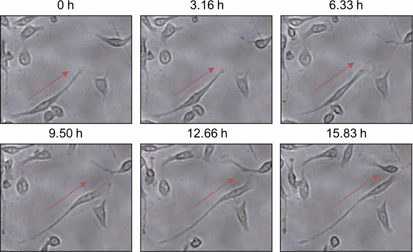 Figure 3 shows a series of time-lapse optical microscopy images capturing the migration of fibroblast cells located on the left side of the cell chamber. Most cells migrated toward the right side containing DMEM and FBS. These images provide strong visual evidence of a cell migration process in which the cytoplasm stretches first and then the cell body moves in the same direction.