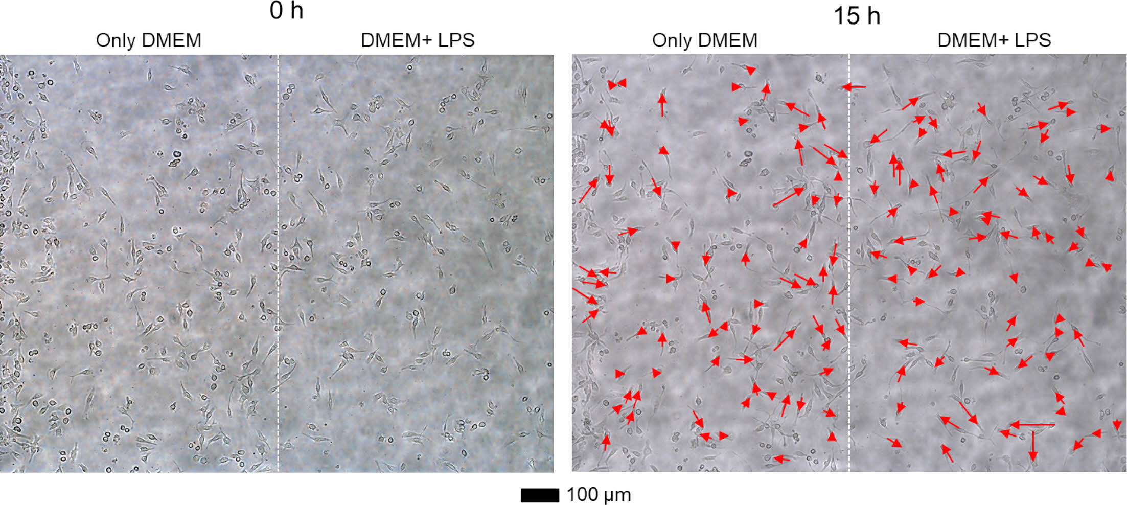 As a next step, we monitored the movement of RAW264.7 cells in the left DMEM and the right DMEM with LPS streams of the cell chamber. Figure 4 shows optical microscopy images of RAW264.7 cells at 0 and 15 h. The cells in the right stream (DMEM with LPS) randomly migrated at the low velocity. However, the cells in the left stream (only DMEM) tended to migrate toward the right direction.