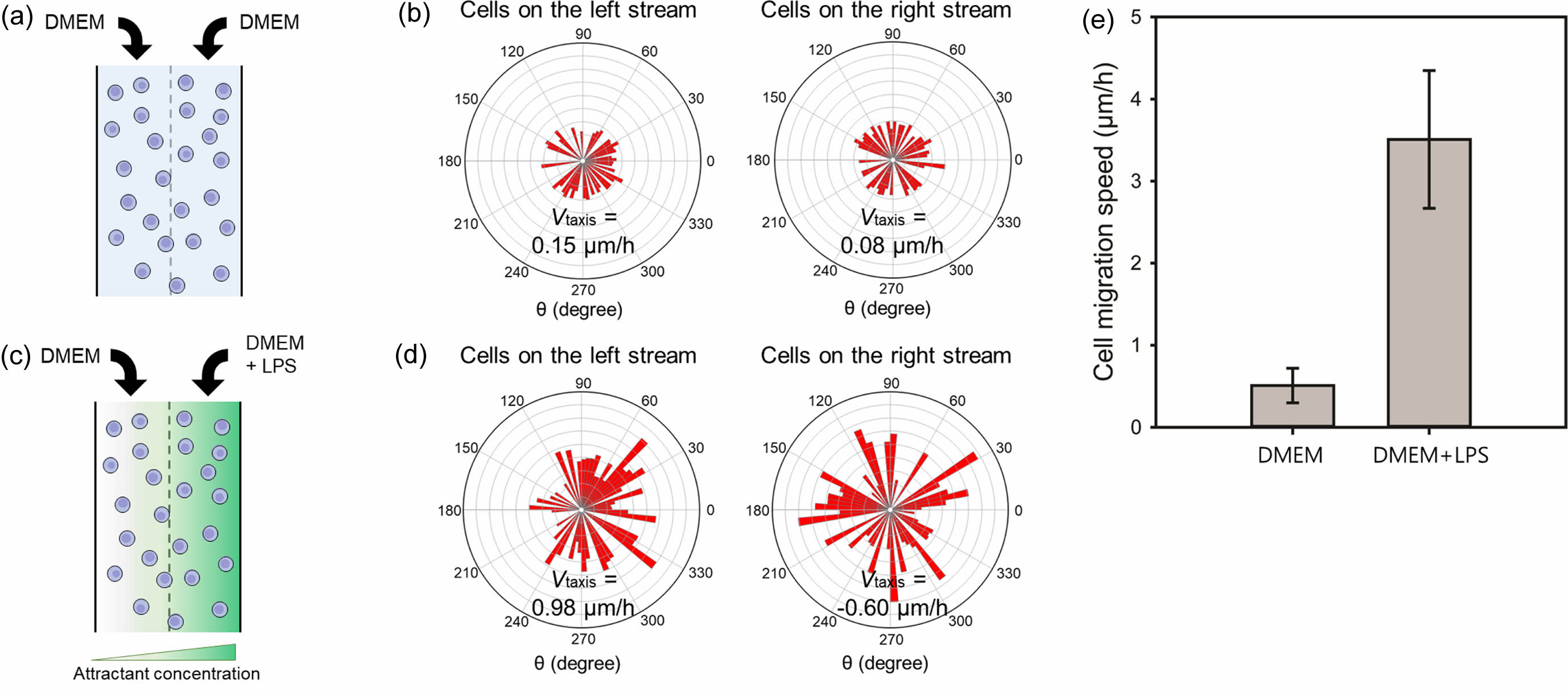 Figure 5 (a, c) A schematic diagram of cells at the chamber; (b, d) movement of RAW264.7 macrophage cells on left and right streams in the (a, b) absence or (c, d) presence of LPS. The total number of macrophage cells was 50 and 70 in the absence or presence of LPS, respectively; (e) Cell migration speed of the RAW264.7 cells located on the left stream of the cell chamber in the absence Figure 5(a) or presence Figure 5(c) of LPS. The migration angle was not considered for the calculation of the cell migration speed. |