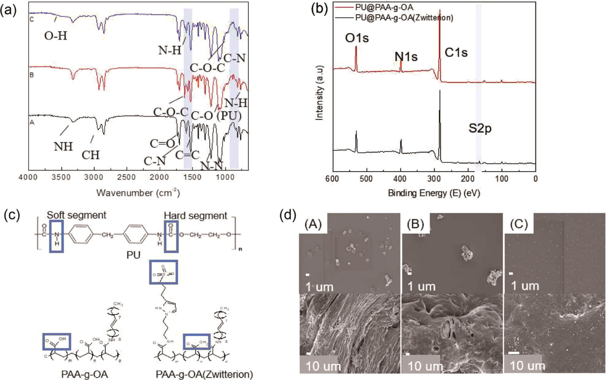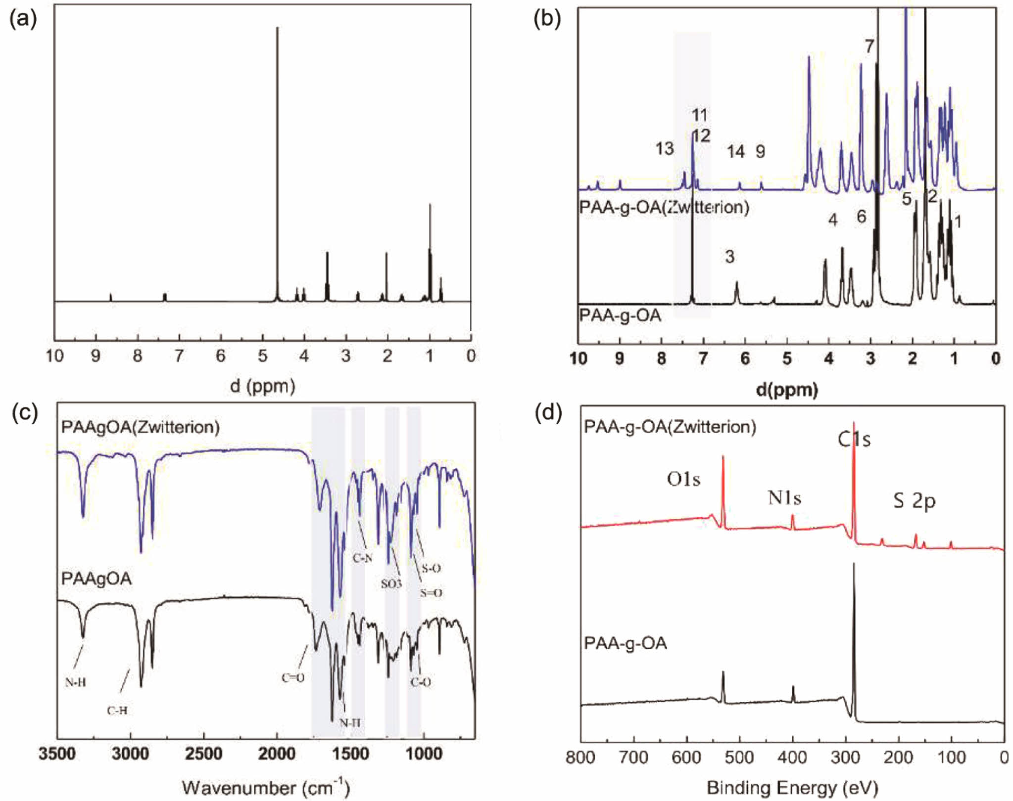 Figure 1 1H-NMR spectra of (a) zwitterion; (b) PAA-g-OA and PAA-g-OAZ; (c) FTIR; (d) fully scanned XPS spectra of PAA-g-OA and PAA-g-OA (zwitterion). |