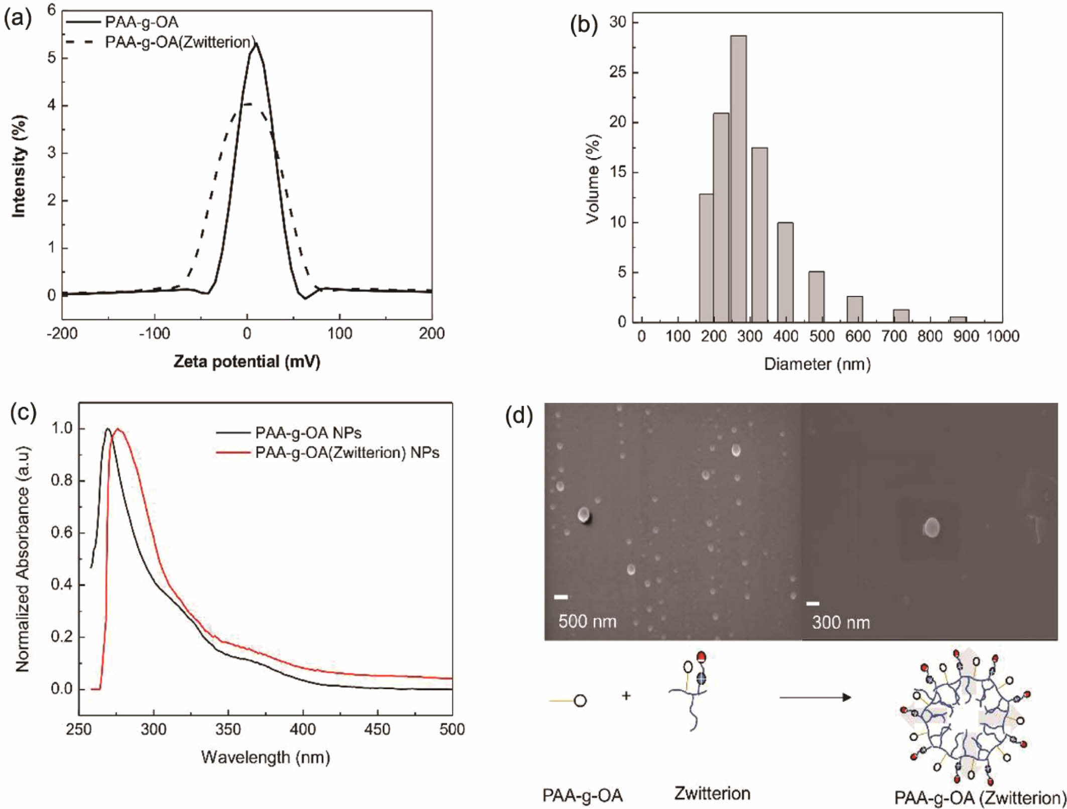Figure 2 NP characterization: (a) zeta potential; (b) hydrodynamic diameter; (c) optical properties of PAA-g-OA (zwitterion) emulsion in the DMF; (d) Micelles structure of the PAA-g-OA (zwitterion) NPs. |