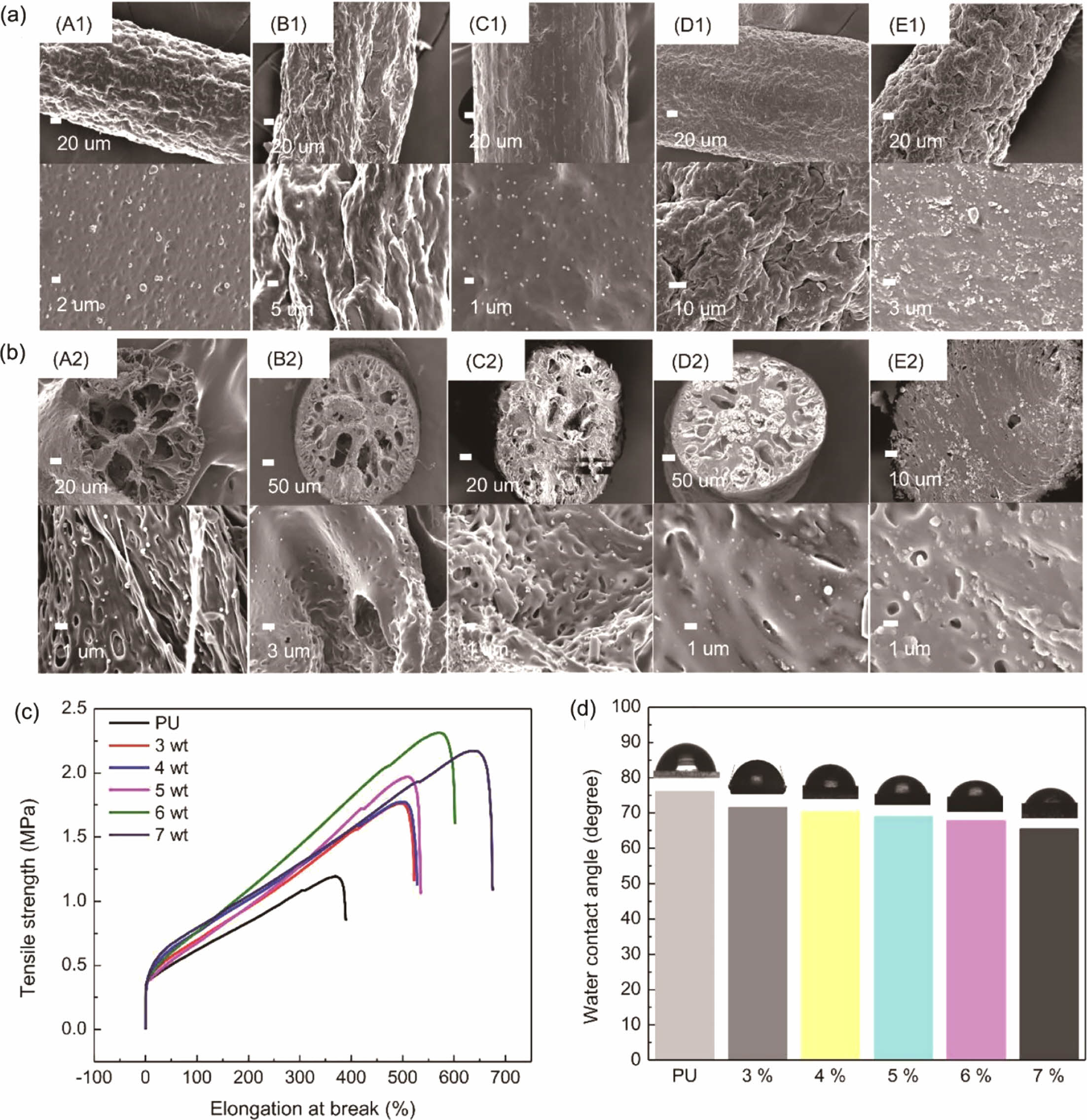 Figure 4 Effect of concentration on the morphology of PU@PAA-g-OA (Zwitterion): (a) surface area of (A1) 3%; (B1) 4%; (C1) 5%; (D1) 6%; (E1) 7%; (b) cross-sectional area; (A2) 3%; (B2) 4%; (C2) 5%; (D2) 6%; (E2) 7%; (c) effect of concentration on the PU@PAA-g-OA (zwitterion) mechanical properties: (d) variation of water contact angles of PU@PAA-g-OA (Zwitterion) relying on NP concentrations. |