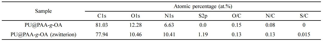 XPS spectra of C1s, O1s, N1s, and S2p states in the PU@PAA-g-OA and PU@PAA-g-OA (Zwitterion) fiber surfaces (Figure 3(b) and S1, and Table 1 and S1) exhibited successful incorporation of NPs into the PU matrix. Especially, the S2p peak at 164 eV verifies the zwitterion in the PU matrix. The atomic peak of S2p representing zwitterion was observed at 1.19%, but this peak was absent in PU@PAA-g-OA.