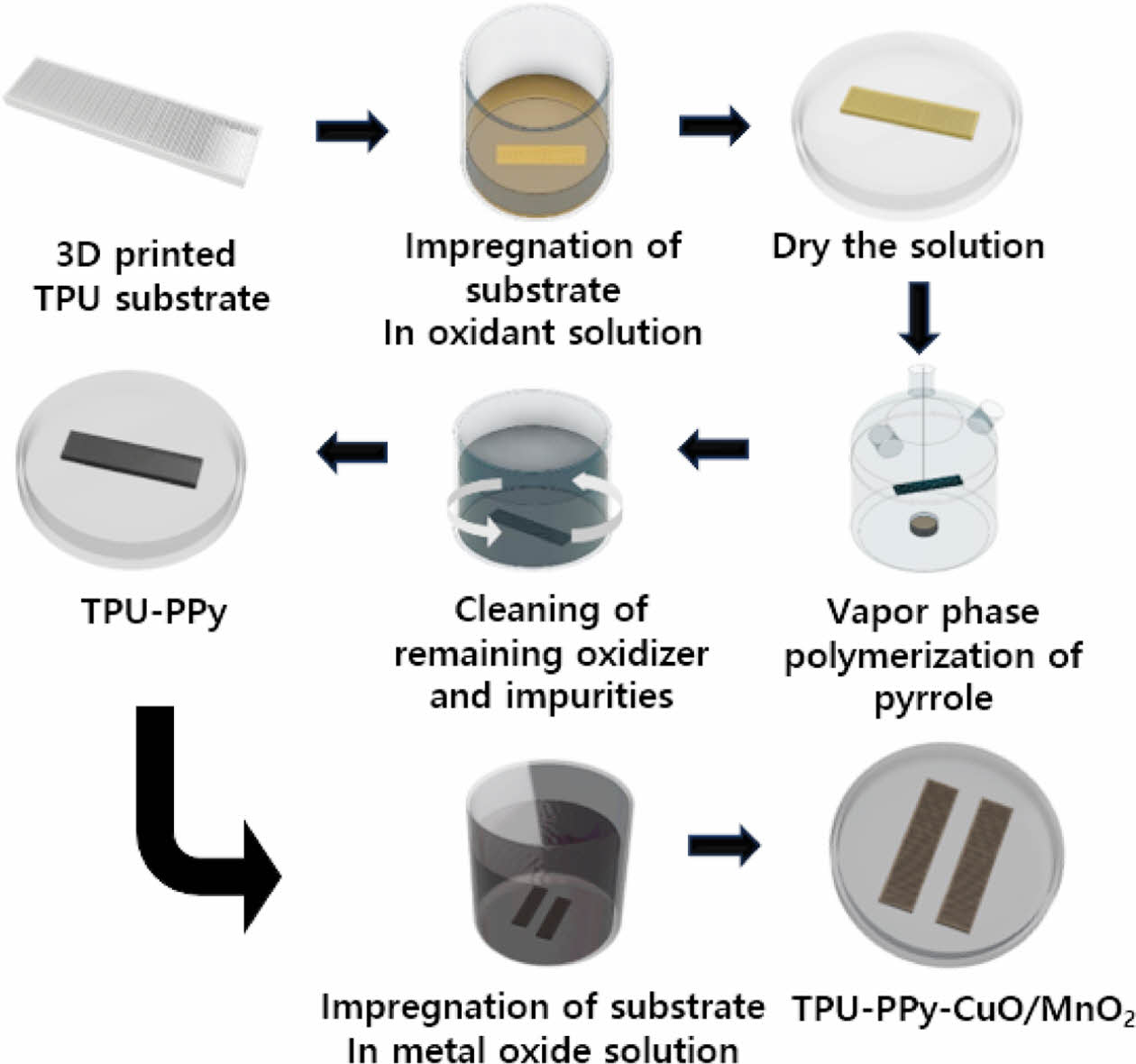 Fabrication of 3D TPU, TPU-PPy, and TPU-PPy-CuO/MnO2. 3D printer (ROKIT, AEP II, Korea), was utilized to assemble TPU. Flexible TPU was 3D printed with a substrate angle of 0 degrees and a 70% infill density. After being soaked in ethanol containing an oxidizing agent at a concentration of 30 weight percent (wt%) for 30 minutes, the TPU was agitated for about 10 minutes. The finished product was allowed to air dry at room temperature for 60 minutes. After adding FTS to the TPU, the mixture was placed in a polymerization room, where PPy was polymerized for 6 hours in a nitrogen atmosphere. The resultant TPU-PPy was air-dried for a minimum of 12 hours after being rinsed in ethanol for 20 minutes to eliminate any residual oxidizing agents.27