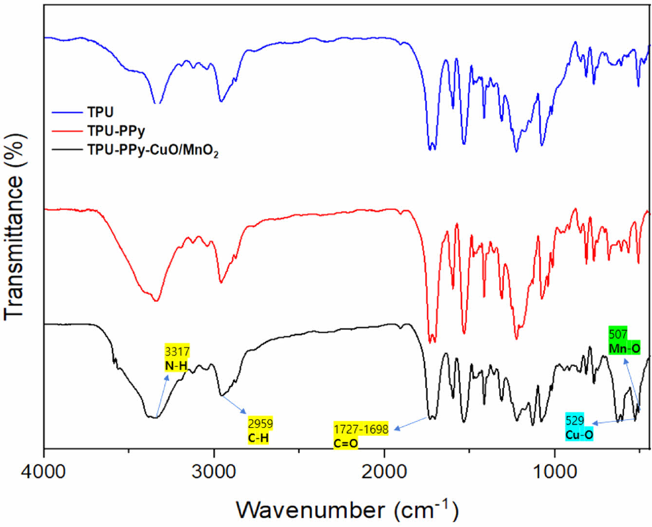 The TPU-PPy-CuO/MnO2-PPy-CuO/MnO2 made by mixing 0.02 g CuO, 0.02 g MnO2, and 15 mL of ethylene glycol for 10 minutes while stirring at 1200 rpm. Then, we added 35 mL of DI water and sonicated the mixture at 50 ℃ up to 90 minutes. The TPU-PPy composite was mixed with the dispersion solution, then subjected to a 6-hour reaction in an oil bath at 60℃, followed by 12-hours of drying in an oven at the same temperature. Figure 1 shows the preparation procedures for TPU-PPy-CuO/MnO2 composites.