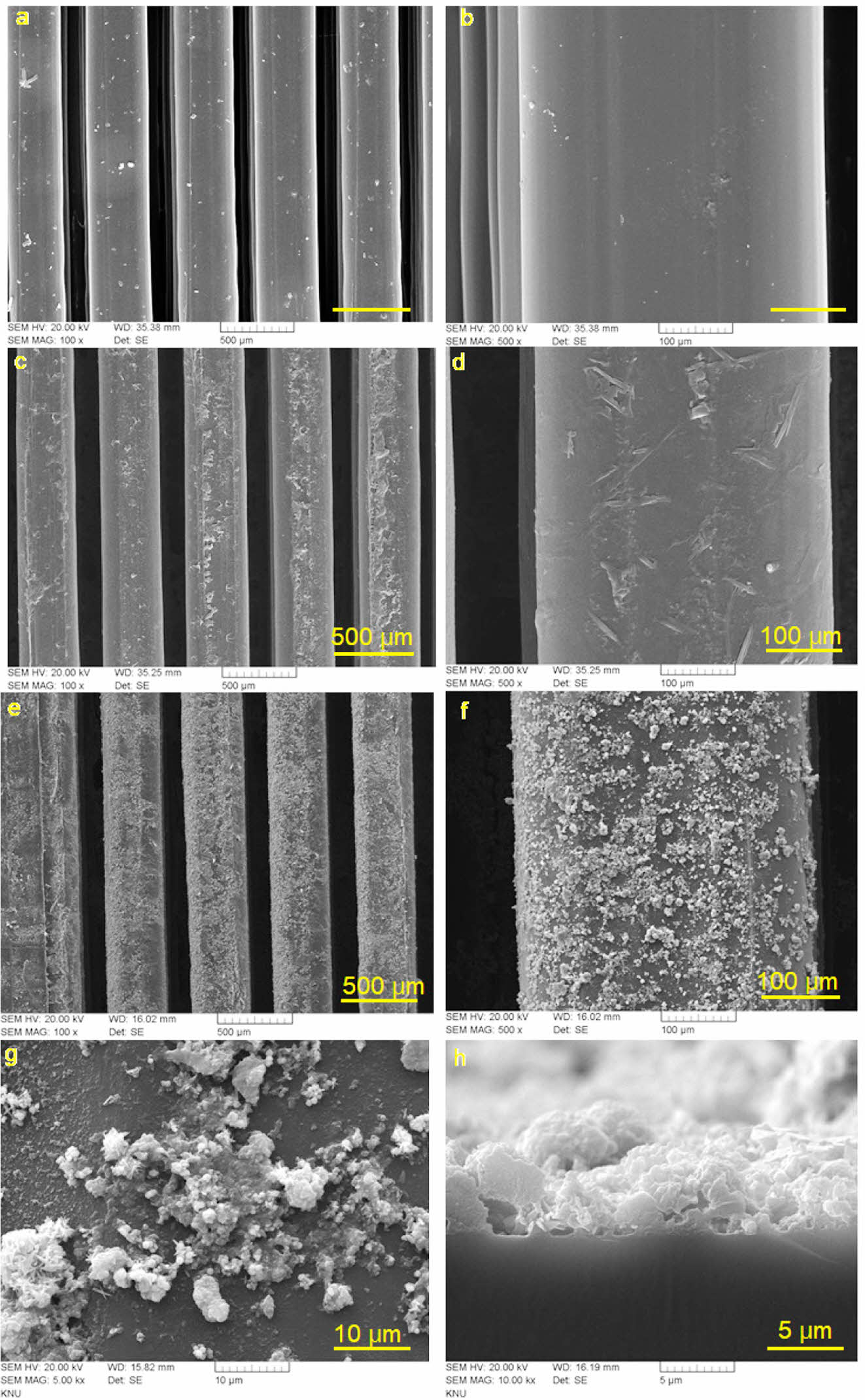 Figure 3 SEM analysis of 3D (a, b) TPU; (b, c) TPU-PPy; (e, f, g) TPU-PPy-CuO/MnO2 composite surface; (h) cross-section of TPUPPy-CuO/MnO2. |