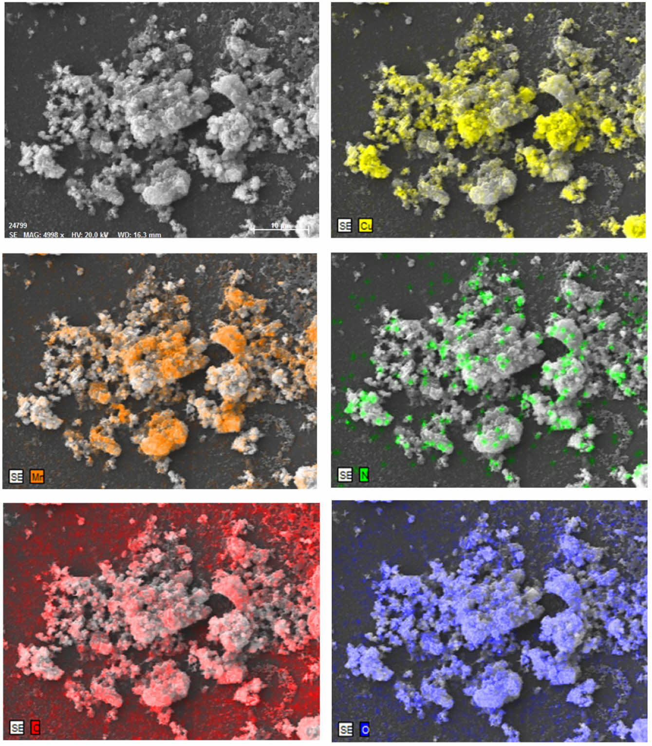 At high magnification, the cross-section surface clearly shows the morphological changes from metal oxide coatings (Figure 3(g) and (h)). From these surface results, the metal particle’s crystal size grows as the lodging time for the initial major stage increases, which is the expected outcome. Additionally, particle aggregation was reduced due to the production of polymers by extensive chains caused by CuO and MnO2 in the TPU-PPy-CuO/MnO2 combination. Also, the EDS mapping (Figure 4) of composite clearly showed the important elements appearances (Cu, Mn, N, C and O), which are the confirmation of the composite formation.