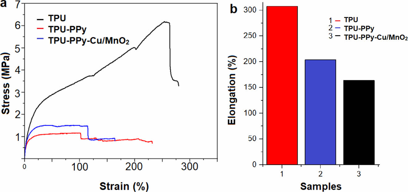 Figure 5 (a) Stress-strain curve; (b) horizontal percentage TPU, TPU-PPy, and TPU-PPy-CuO/MnO2 composites. |