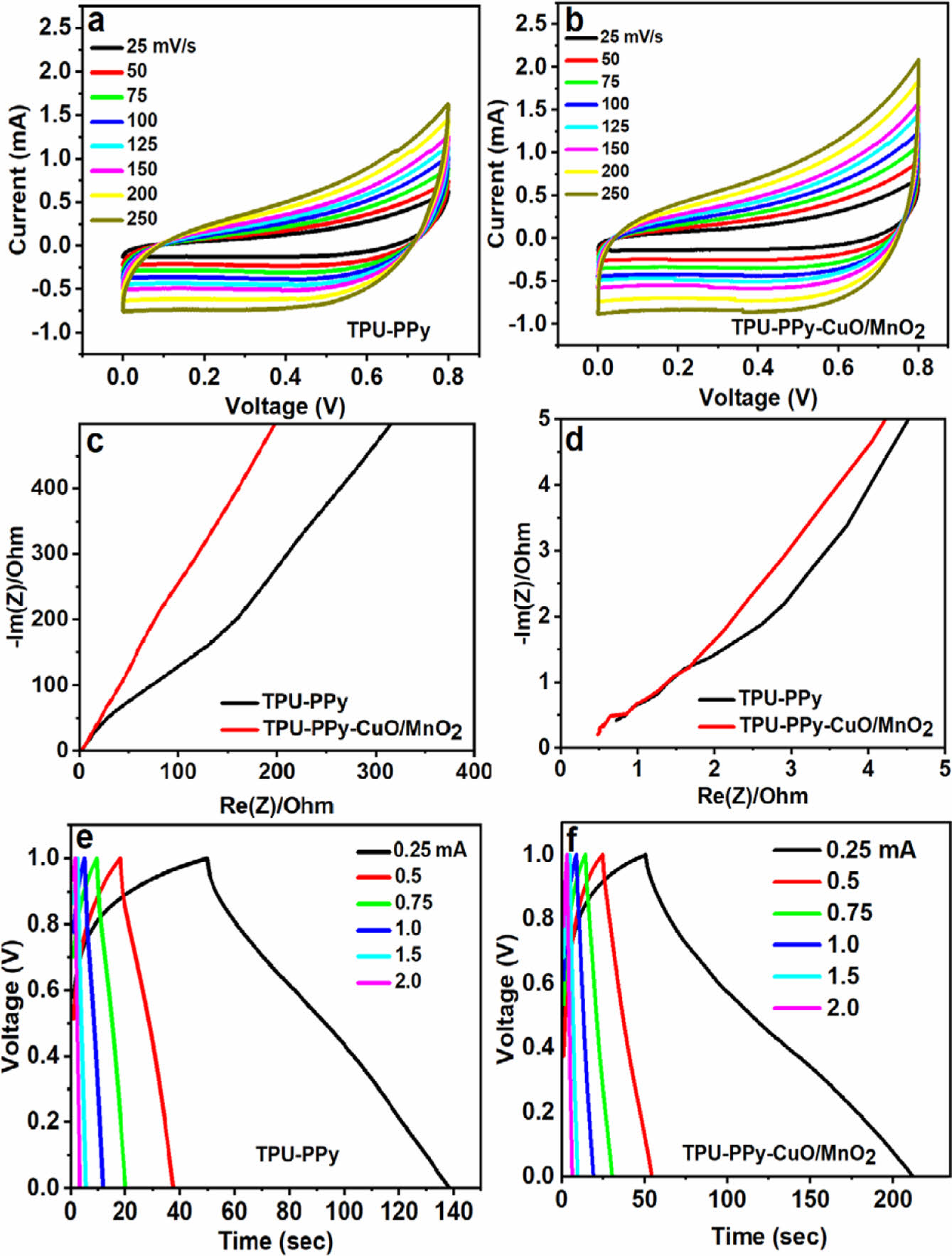 Electrical Characterizations of TPU-PPy and TPU-PPy-CuO/MnO2 Constructed SCs. The electrochemical behaviors of the TPU-PPy and TPU-PPy-CuO/MnO2 SC electrodes were examined from a workstation (SP-150, BioLogic). This instrument was employed to achieve the corresponding cyclic voltammetry (CV), galvanostatic charge-discharge (CD), and electrochemical impedance spectroscopy (EIS).