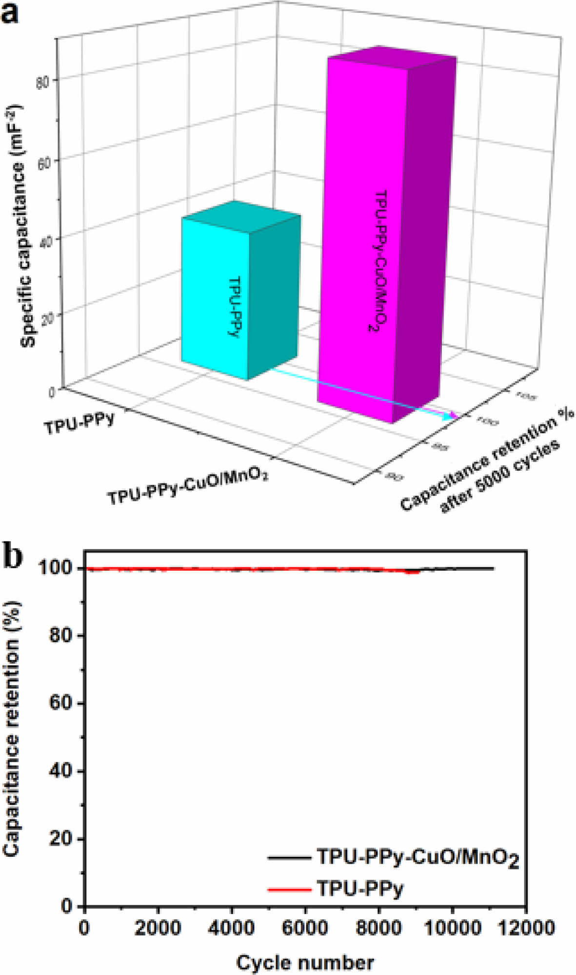 Figure 7(b) shows that cyclic stability is another criterion for evaluating the performance of the SC. The 3D composite SCs made of TPU-PPy and TPU-PPy-CuO/MnO2 were studied for their long-term cyclic performance more than 10000 cycles using GCD tests conducted. The two 3D SCs have substantially lower capacitance retention rates (~98.8%). This type of 3D flexible SC device for storing energy levels over a prolonged period of time would benefit from the stability and capacitance retention capabilities achieved. The composite electrode materials are likely responsible for the achieved cyclic stability. Merging 3D TPU with PPy and CuO/MnO2 strengthens the bonds between the composite's constituent parts, leading to enhanced mechanical characteristics and capacitance cycle stability.35,36