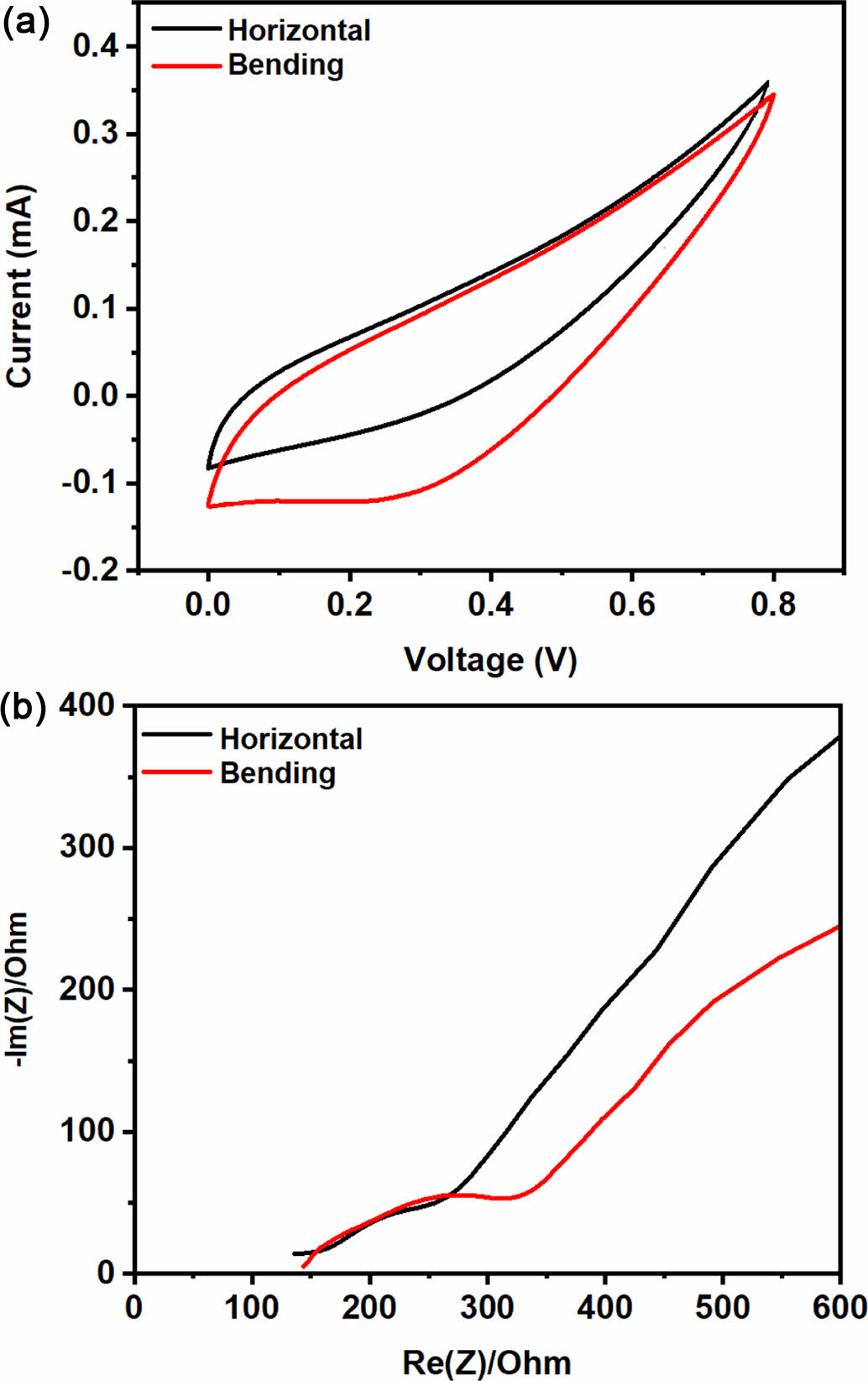 Figure 8 (a) CV; (b) EIS of TPU-PPy-CuO/MnO2 SC performance under elongation and bending conditions. |