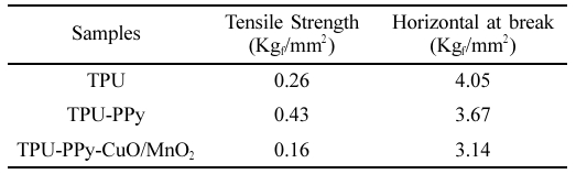 Mechanical Possessions of 3D TPU-PPy and TPU-PPy-CuO/MnO2. The mechanical actions of TPU-PPy and TPU-PPy-CuO/MnO2 combinations are depicted in Figure 4 and can also be found in Table 1. The clean TPU matrix stress-strain curve makes it abundantly clear (Figure 5(a)), and the addition of TPU-PPy and TPU-PPy-CuO/MnO2 causes a reduction in both the modulus and the strength of the material. The horizontal percentage was also influenced (Figure 5(b)). Table 1 also clearly indicates the tensile properties of the composites; the tensile strength is reduced from 0.26 Kgf/mm2 (TPU) to 0.16 Kgf/mm2 (TPU-PPy-CuO/MnO2). Both the uniform dispersion of CuO and MnO2 particles, which have stiff characteristics, and the uniform dispersion of PPy particles, which lend flexibility to the TPU matrix, can be credited with this result. The observed decline in mechanical characteristics can be recognized to a number of factors, including the weakening of intermolecular connections, changes in thermal, chemical, and structural properties brought on by oxidation, and the addition of heat brought on by CuO and MnO2.