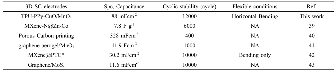 The 3D printed SC performance was compared with recent reports in terms of 3D printed metal oxides and polymer composites (Table 2). From the comparison data, this reported 3D TPU-PPy-CuO/MnO2 SC exhibited better cyclic stability and flexibility performances. Also, it clearly seems the bending and horizontal performances are very important, even with the high capacitance obtained. The PPy composed of 3D structural electrode surfaces; the preferred TPU-PPy-CuO/MnO2 composite samples are abundant in carbon, oxygen, and nitrogen in a variety of charge-discharge states. Going along with the contradictory trend as the -N+ component is the prospectively dependent -N = section of PPy. It is clear from these findings that the oxidation and reduction of PPy nitrogen are responsible for the charge-storage of the composite electrode in the TPU-PPy-CuO/MnO2 hybrid system.