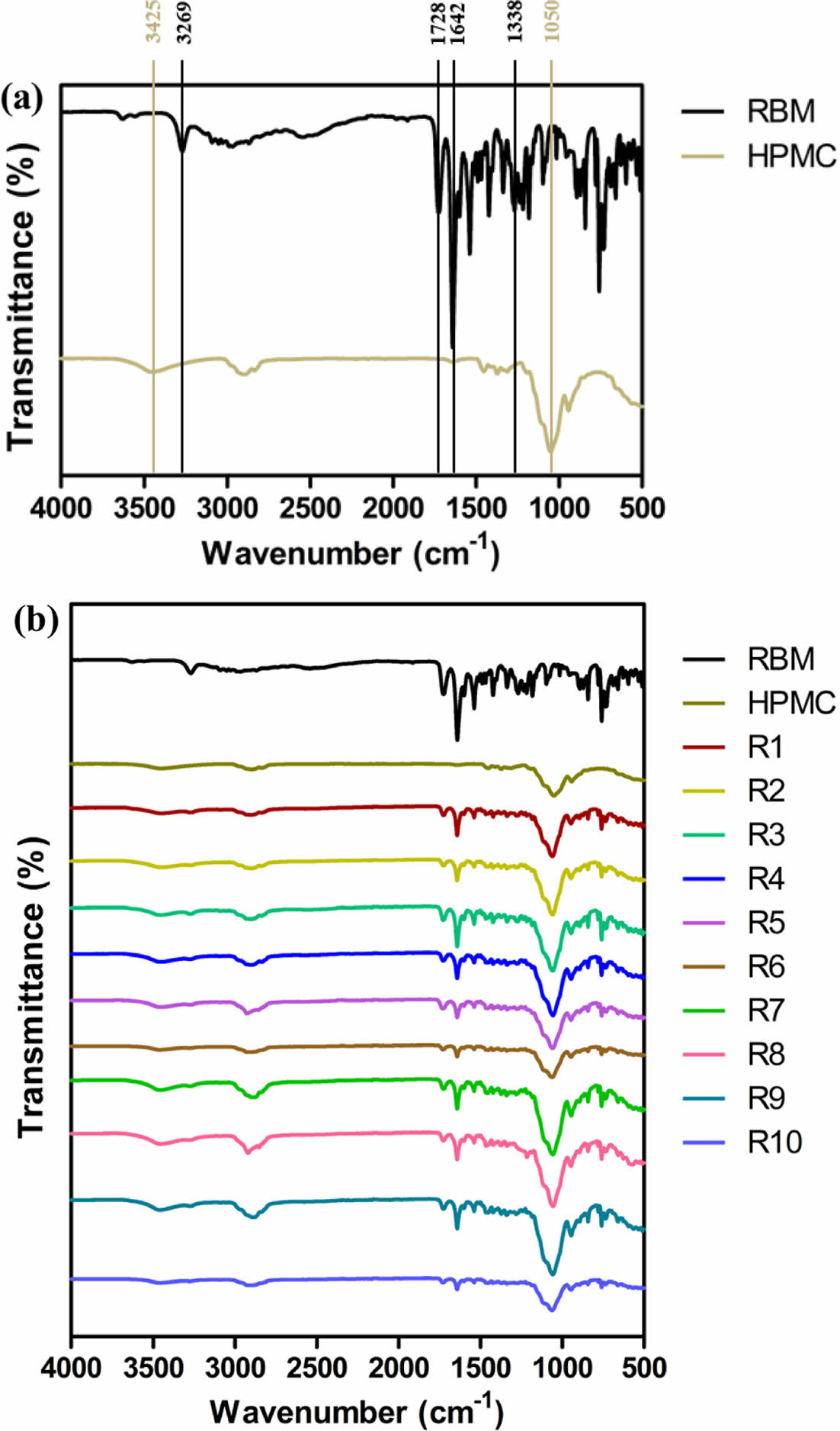 The FTIR spectra of (a) rebamipide, hydroxypropyl methylcellulose; (b) solide dispersions.