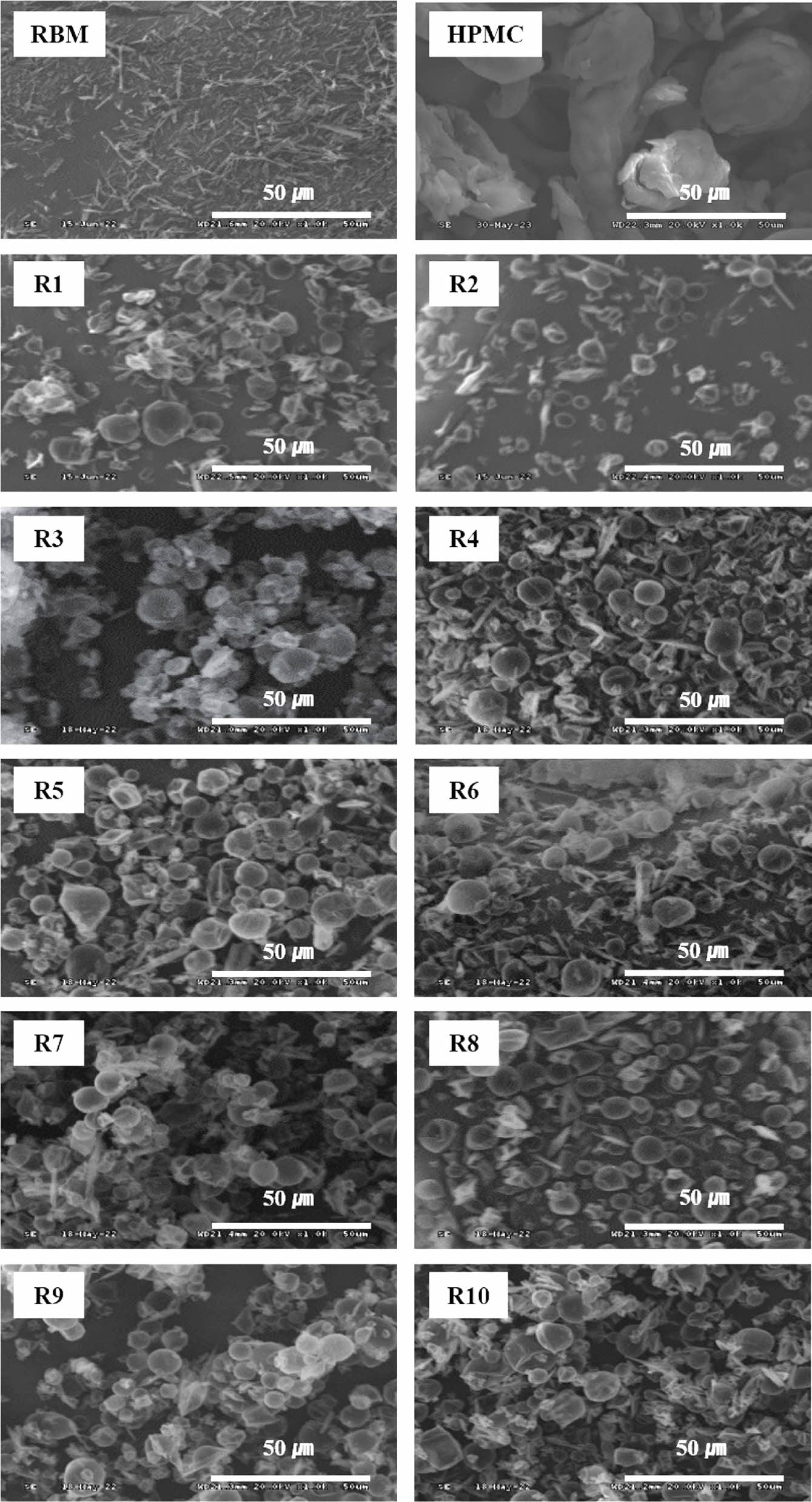 SEM micrographs of Rebamipide, Hydroxypropyl methylcellulose and solid dispersions.