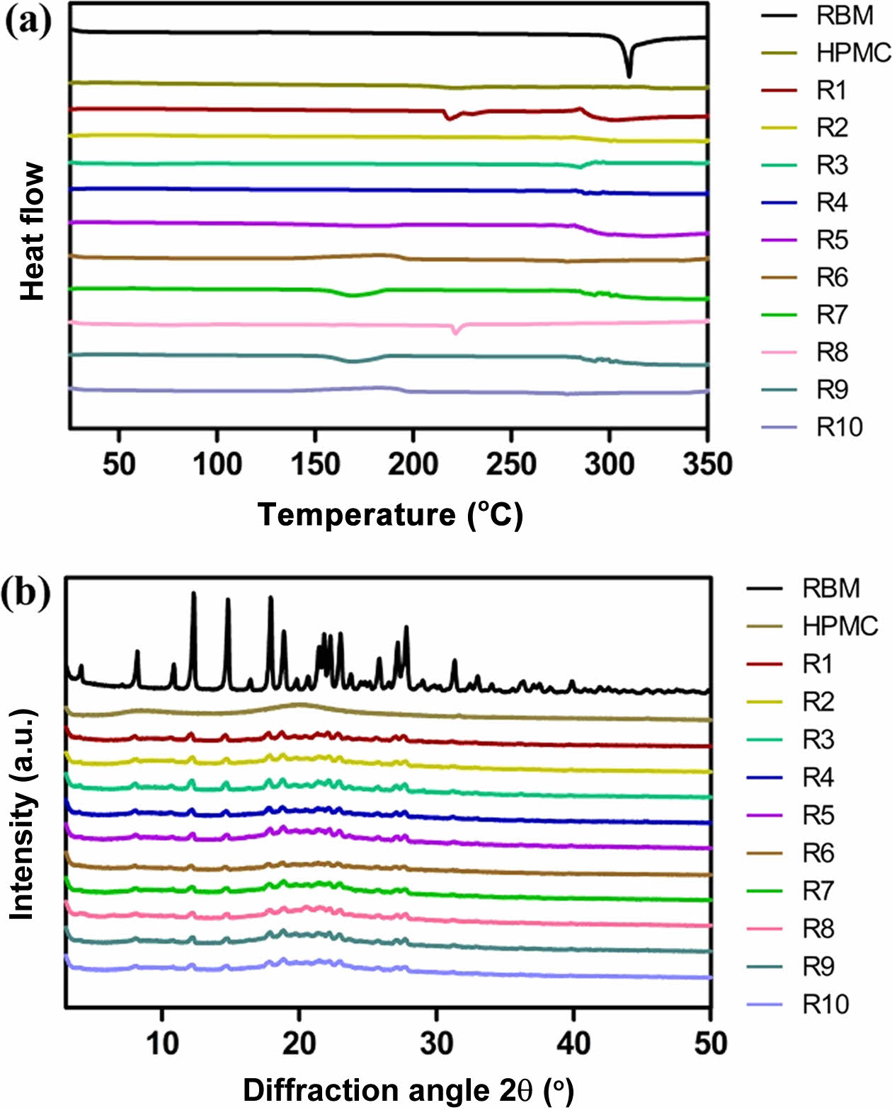 고체분산체의 열역학적 및 결정학적 분석. 레바미피드, HPMC, 각 고체분산체(R1-10)의 DSC와 XRD로 분석한 결과는 Figure 3에 나타내었다. Figure 3(a)는 DSC 분석 결과로 레바미피드는 310 ℃에서 특징적인 흡열 피크를 보였으며 이는 레바미피드가 특유의 결정 형태를 가지고 있음을 확인하였다. 반면, 고체분산체(R1-10)에서는 결정성을 나타내는 특징적인 흡열 피크가 나타나지 않았으며 이는 약물의 결정형이 무정형으로 상전환되었음을 나타낸다. 또한 Figure 3(b)에 나타낸 XRD 분석 결과로부터 레바미피드는 40° 이하의 다양한 각도에서 많은 특징적인 피크가 나타나 결정성이 높다는 것을 확인하였고, 고체분산체의 경우 레바미피드의 특징적인 피크들이 사라졌음을 확인할 수 있다. 이러한 차이는 분무건조를 통해 약물이 무정형의 고분자 매트릭스에 효과적으로 분산되어 결정형에서 무정형으로 전환된 것으로 사료된다.