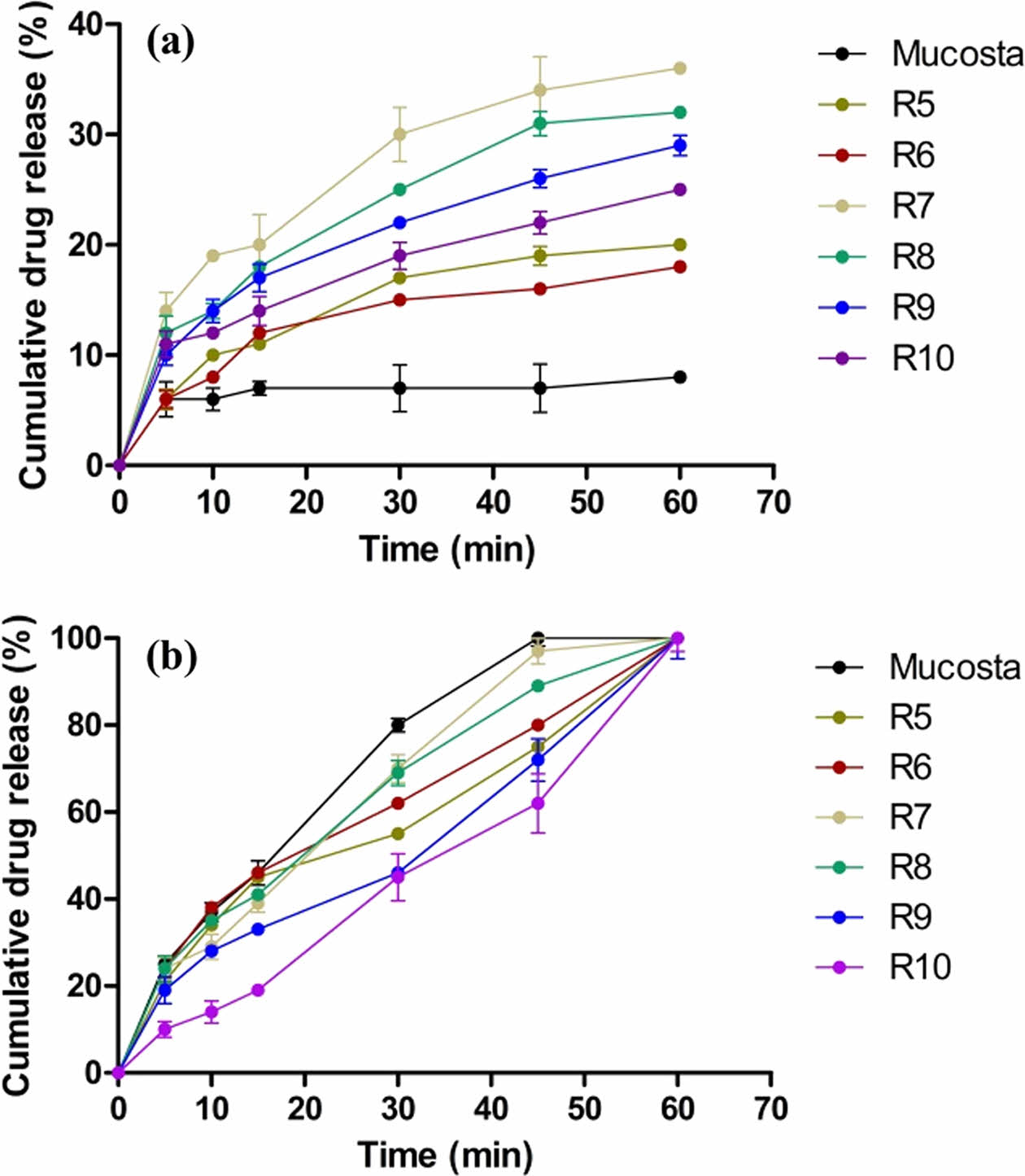 Dissolution profiles of R5-10 capsule, and MucostaTM capsule in (a) artificial gastric juice (pH 1.2); (b) purified water.
