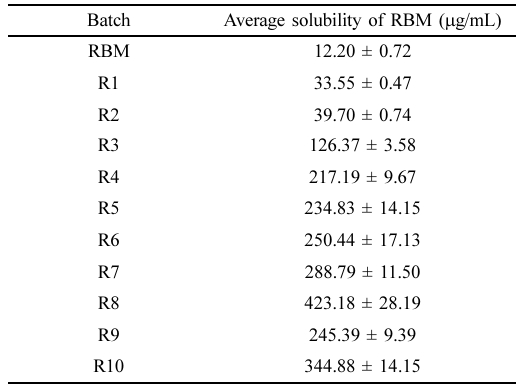 Solubility Results of RBM and Solid Dispersions in Water at Room Temperature (n = 6, mean ± SD)