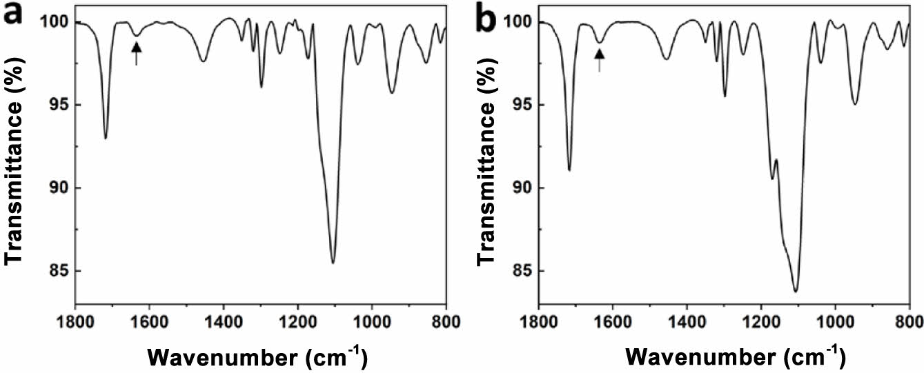 Figure 1 FTIR spectra of (a) PEGMEMA; (b) PEGDMA. C=C double bond peak was indicated with an arrow. |