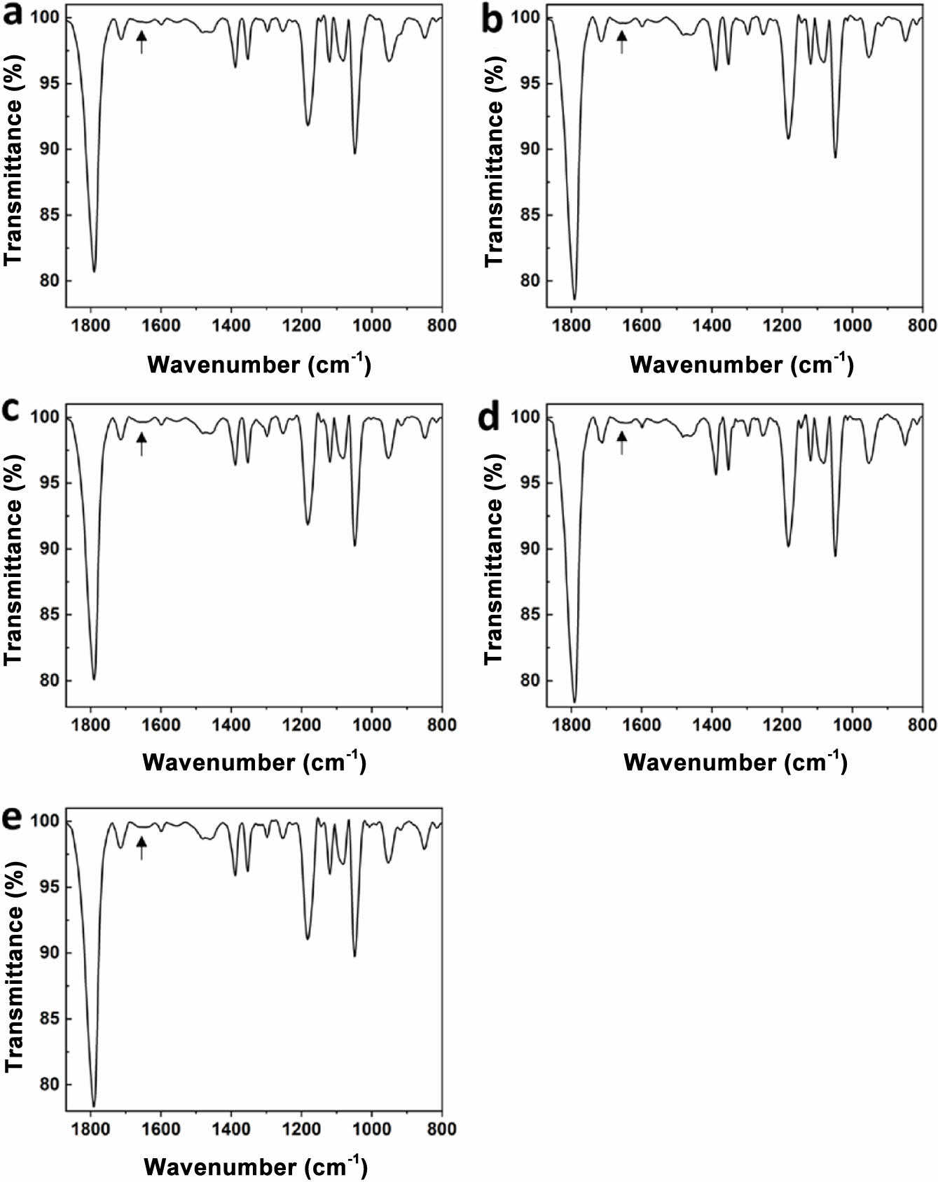 Figure 2 FTIR spectra of electrolytes after UV curing for 5 min: (a) GPE1; (b) GPE2; (c) GPE3; (d) GPE4; (e) GPE5. C=C double bond peak was indicated with an arrow. |