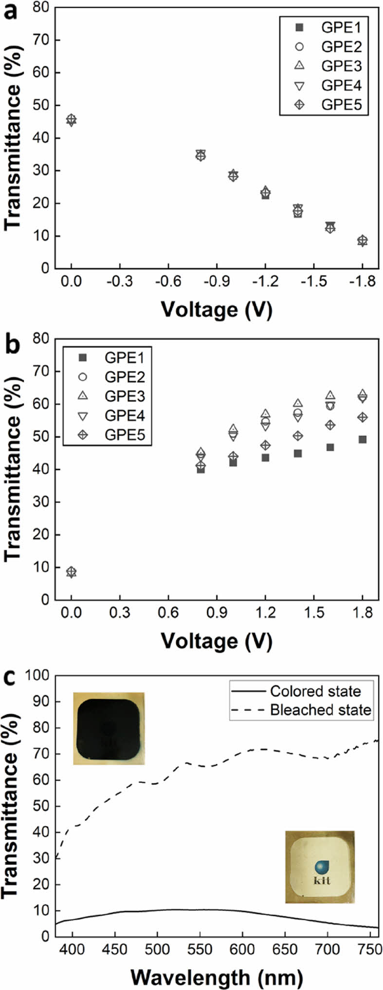 The transmittance of ECDs before applying voltage was similar for all samples at approximately 45%. A voltage was applied to each sample from -0.8 V to -1.8 V in 0.2 V increments, and after waiting a sufficient time, the transmittance at each voltage was measured. The transmittance during coloring showed a monotonic decrease as the voltage increased, and the trend was similar for all electrolyte compositions (Figure 3a and 3b). The transmittance at -1.8 V was 8.2 to 8.8%, with a slight difference. On the other hand, the transmittance in the bleached state was the lowest at 49.2% for GPE1, between 62 and 63% for GPE2-4, and 56% for GPE5. The transmittance for GPE3 wavelength was inserted as a representative example (Figure 3(c)). The color at the colored state of GPE3 was close to black (inset at the top of Figure 3c) due to the combination of the bluish color of WO3 and the brownish color of NiO. In the bleached state, it became transparent, allowing the logo on the background to be seen (inset at the bottom of Figure 3c).