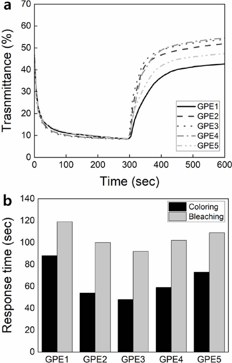 Figure 5 (a) Time-dependent transmittance change for coloring and bleaching; (b) response time, tc,90% and tb,90%, comparison between electrolytes. |