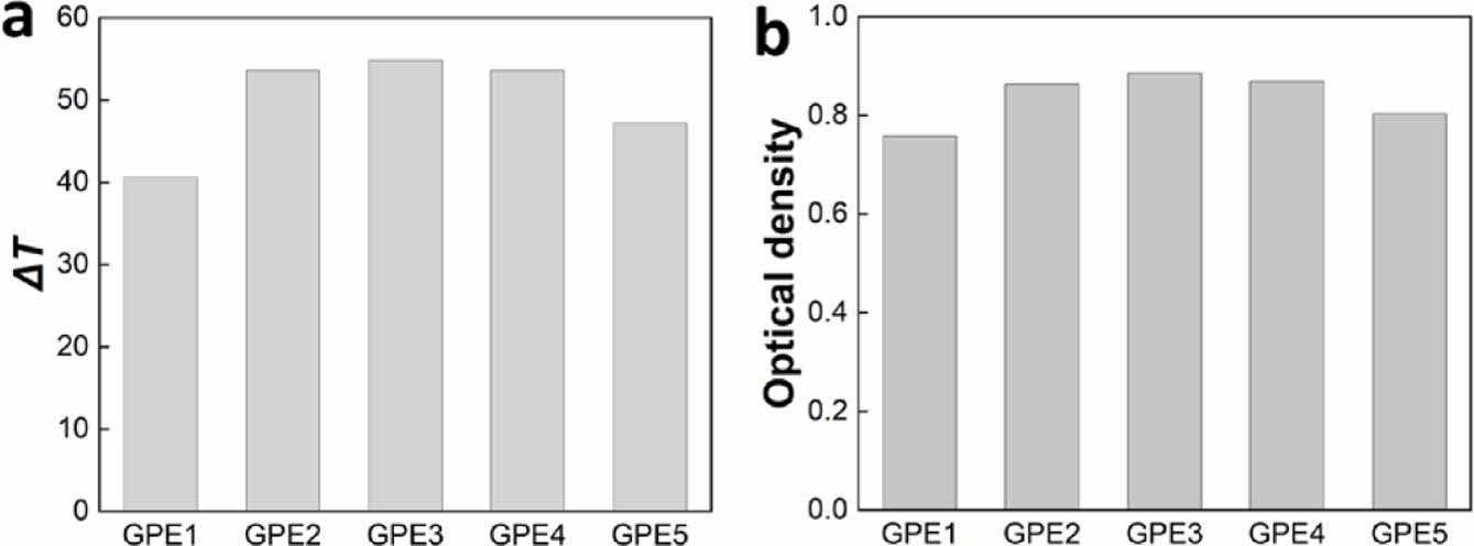 The highest ΔT and optical density were observed in GPE3, showing 54.8% and 0.89, respectively.
