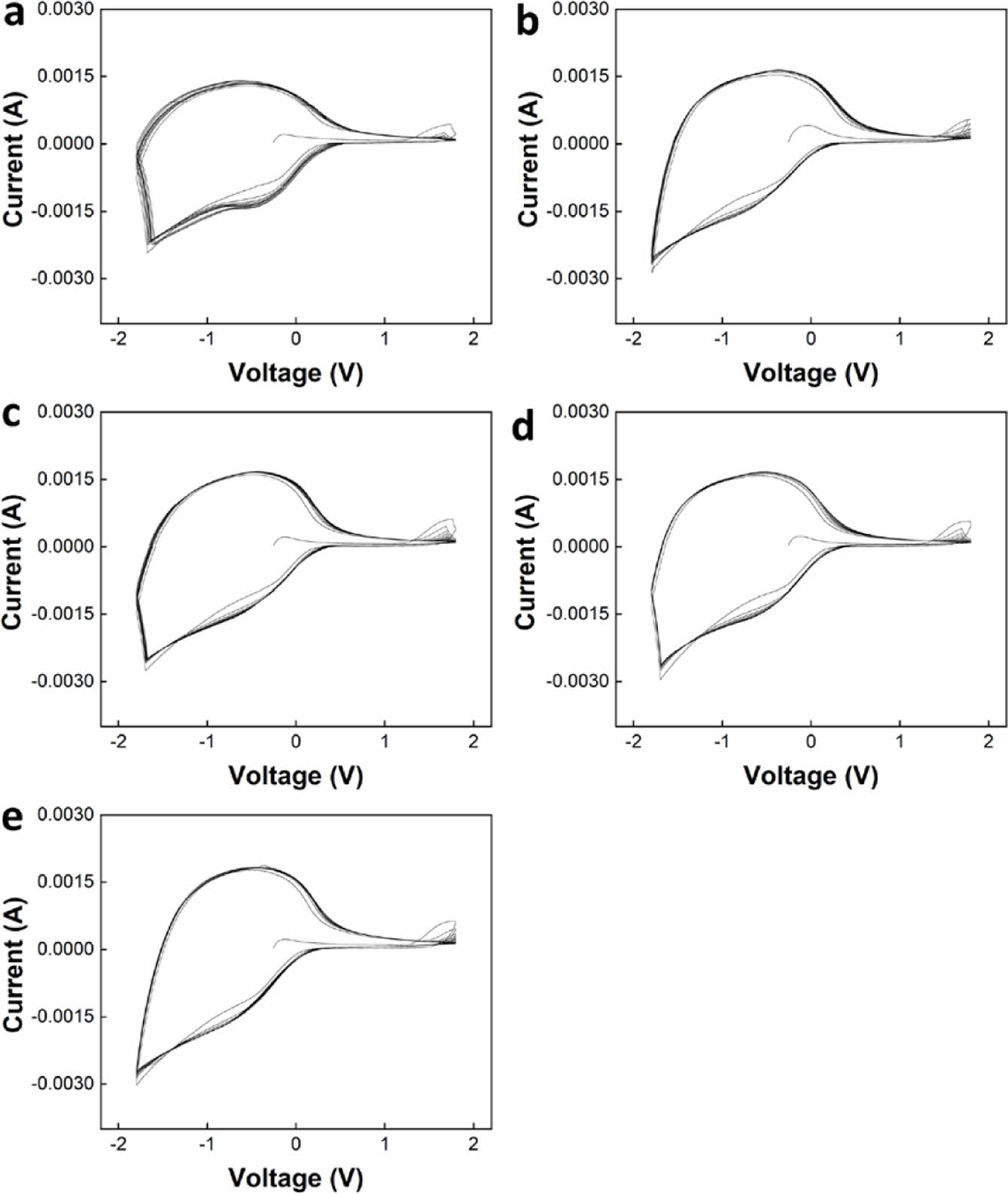 Each CV curve was measured for 20 cycles. For all electrolytes, the shape of the CV curve quickly stabilized in the initial cycle, and no significant change in the shape of the curve was observed with increasing cycle number.