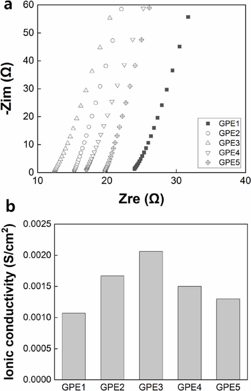 As shown in Figure 7(b), ionic conductivity was lowest in GPE1, which had the highest PEGDMA ratio, and increased as the PEGDMA content increased, reaching the highest in GPE3. As the PEGDMA content further increased, ionic conductivity decreased. The highest and lowest ionic conductivities were 0.00206 S/cm2 and 0.00107 S/cm2, respectively, observed in GPE3 and GPE1. It is speculated that the high ionic conductivity of 10-3 S/cm2 is due to the solvent content more than 50 wt%.