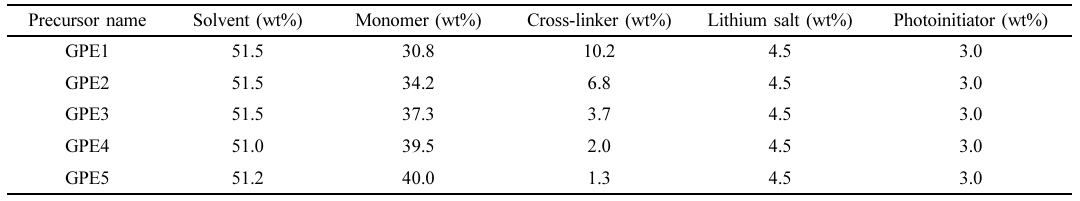 Preparation of Precursors for Electrolytes. Precursors for the in situ preparation of electrolytes are composed of monomer, cross-linker, lithium salt, photoinitiator, and solvent, as shown in Table 1. PEGMEMA, PEGDA, lithium perchlorate, irgacure 2959, and propylene carbonate were used as a monomer, cross-linker, lithium salt, photoinitiator, and solvent, respectively. Monomer to cross-linker ratio in the precursors was controlled 3:1, 5:1, 10:1, 20:1, and 30:1, and they were designated as GPE1, GPE2, GPE3, GPE4, and GPE5, respectively, as shown in Table 1.