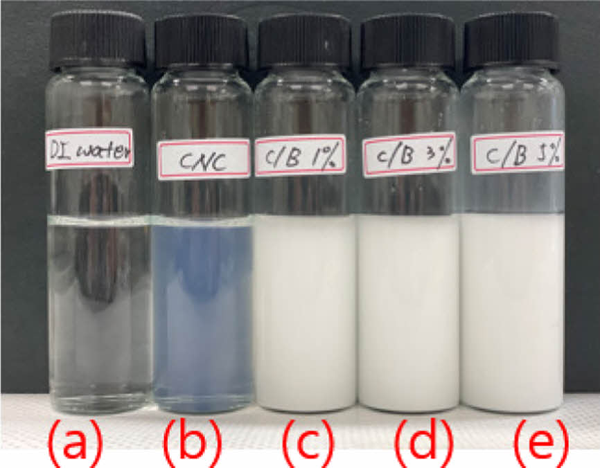 Image of the CNC/BaSO4 mixed solution after dispersion: (a) DI water; (b) CNC 0.5%; (c) CNC/BaSO4 1%; (d) CNC/BaSO4 3%; (e) CNC/BaSO4 5%.