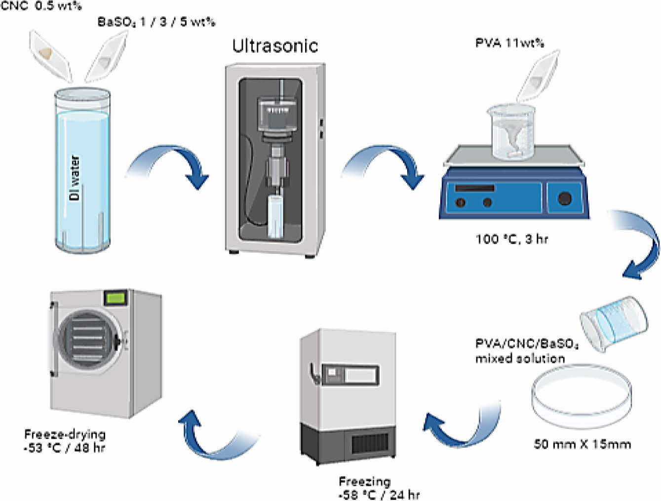 Image of the manufacturing process of the PVA/CNC/ BaSO4 scaffold.
