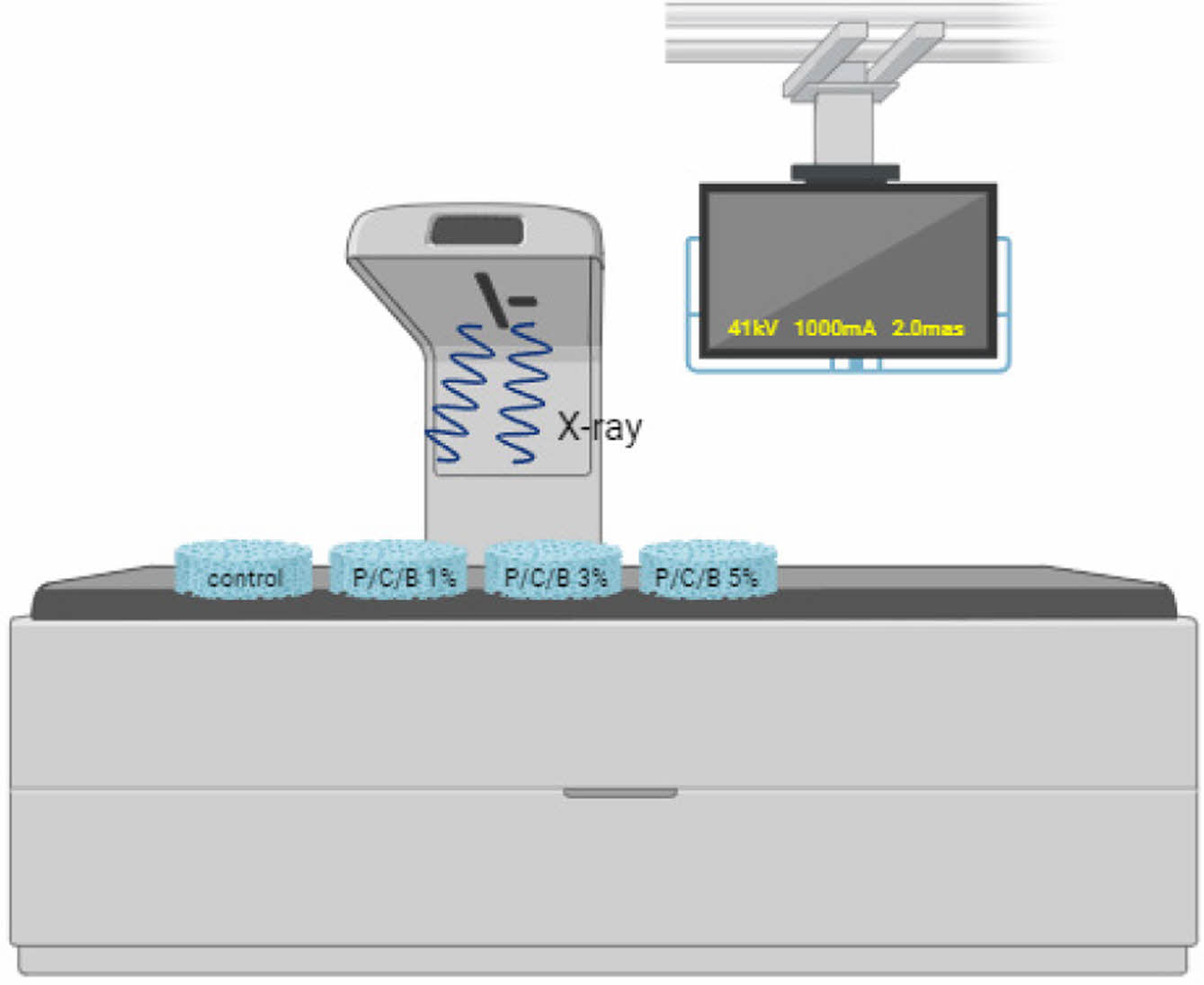 지지체의 방사선불투과성 및 생체적합성 평가. Radiopacity: 방사선불투과성 측정을 위해 경북 경산시에 소재한 모 병원의 X-선 촬영장치인 DHF-155HⅡ(Hitachi, Japan)을 사용하여 전압 41 kV, 전류 100 mA, 노출시간 2초로 촬영하였으며, 측정장비에 연결된 모니터를 통해 영상화된 사진을 취득하였다. 촬영방법은 Figure 3에 나타내었다.