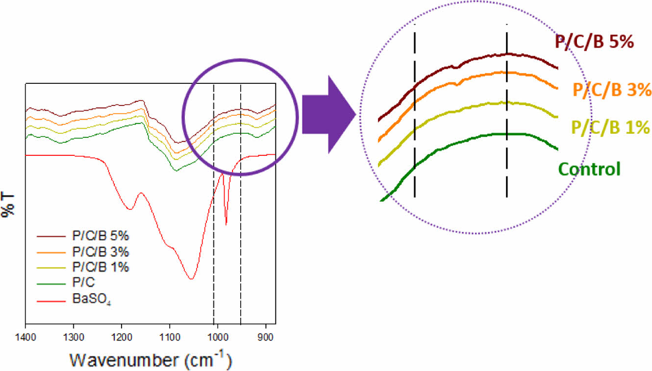 FTIR spectra profiles of PVA/CNC/BaSO4 scaffolds with different BaSO4 content.