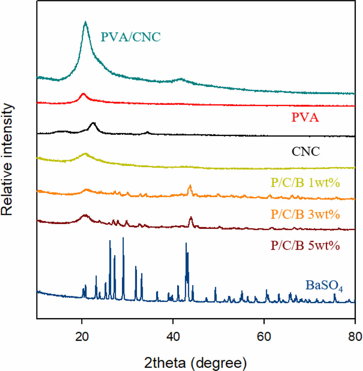 X-ray diffraction patterns of the BaSO4 and PVA/CNC/ BaSO4 scaffolds with different BaSO4 content.