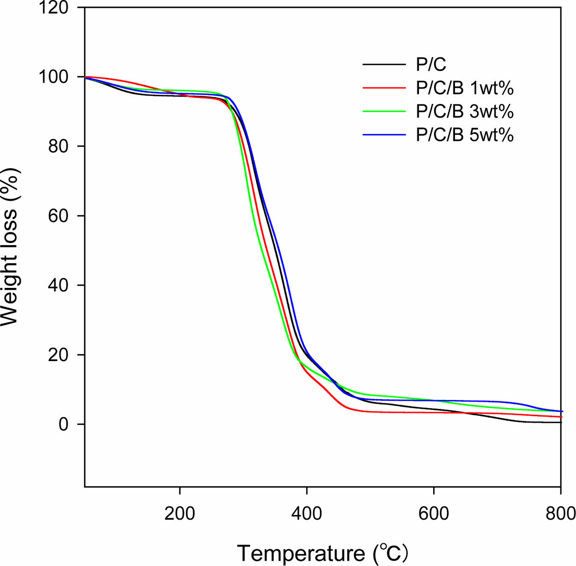 TGA curves of the PVA/CNC/BaSO4 scaffolds with different BaSO4 content.
