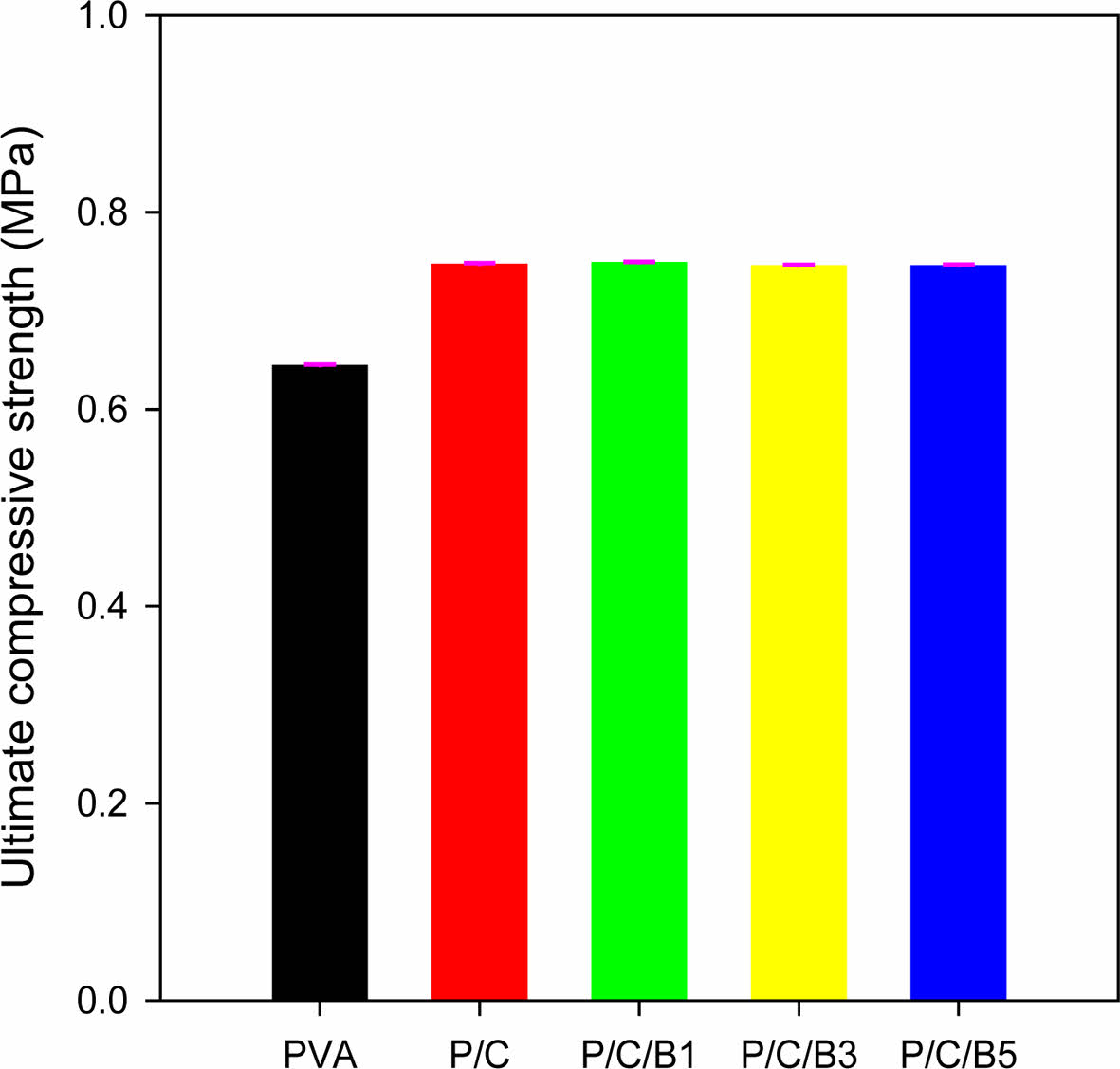 Ultimate compressive strength of PVA/CNC/BaSO4 scaffolds with different BaSO4 content.