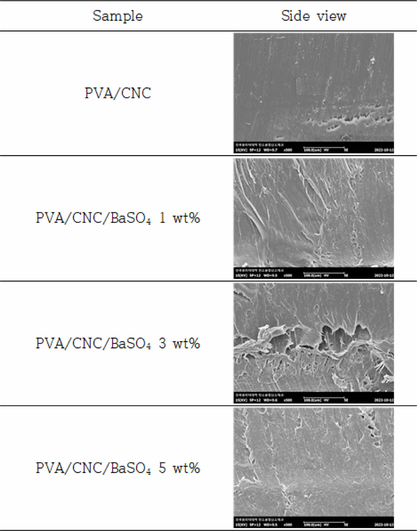 SEM-EDS: Figure 9는 PVA/CNC/BaSO4 지지체의 SEM 측정결과이다. 외관상 변화는 크지않고 BaSO4 함유량이 증가할수록 BaSO4 입자가 많이 관찰되었다. 또한, EDS 측정을 통해 성분분석을 진행하였으며, BaSO4 첨가량이 높아질수록 해당성분 검출량이 높아지는 것을 확인하였고, 지지체의 부분별 무작위 측정시 유사한 성분값이 검출됨에 따라 적절한 분산성을 가지는 것으로 판단하였으며, 측정 결과를 Figure 10에 나타내었다.