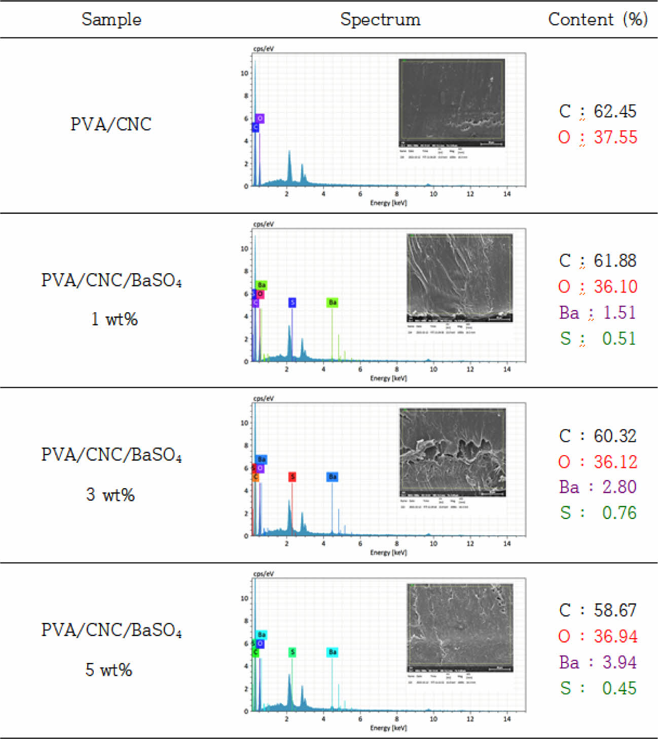 SEM-EDS spectrum of the PVA/CNC/BaSO4 scaffolds with different BaSO4 content.