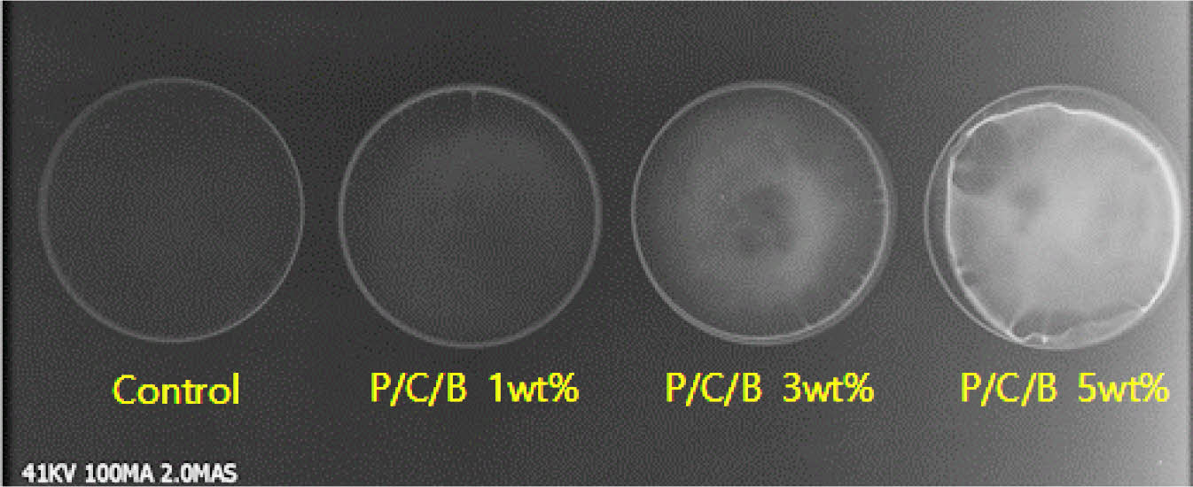 지지체의 방사선불투과성 및 생체적합성 평가. Radiopacity: PVA/CNC/BaSO4 지지체의 X-선 촬영 결과를 Figure 11에 나타내었다. PVC/CNC(control) 시료와 PVA/CNC/BaSO4 시료를 비교하였다. BaSO4의 함량 증가로 인해 생체 내에서 지지체의 추적이 용이해지며, 그 함량이 높을수록 방사선 불투과성이 높아져 지지체 식별이 향상되는 것을 관찰하였으며, 5 wt% 함량 첨가시 뚜렷한 관찰이 가능함을 확인하였다.