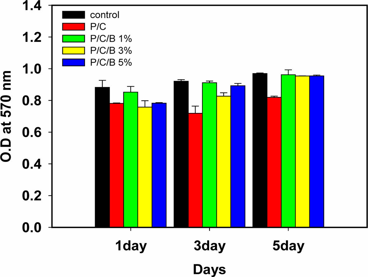 3-[4,5-dimethylthiazol-2-yl]-2,5 diphenyl tetrazolium bromide(MTT) assay: PVA/CNC/BaSO4 지지체의 세포 생존능(cell viability)을 확인하기 위해, 1.5 cm 정사각형 모양으로 자른 후, 에틸알콜(ethyl alcohol)을 20, 40, 60, 80, 100% 농도로 1시간 간격으로 소독한 후, 70% 에틸알콜에서 24시간 멸균 처리하였다. 세포 배양 배지는 DMEM(Dulbecco’s Modified Eagle Medium, Gibco BRL., USA)에 우태아혈청(Fetal Bovine Serum, Gibco BRL., USA) 10%와 항생제(Penicillin-streptomycin, Gibco BRL., USA) 1%가 함유된 배양액을 만든 후, 세포배양 플라스크에 분주하여 37 ℃, 5% CO2 환경에서 배양하고 배양액은 하루에 한 번씩 교체하였다. 배양기에서 형성된 단층 세포를 0.05% trypsin–EDTA(Gibco BRL., USA)로 분리한 후, 4 ℃에서 1000 rpm으로 5분 동안 원심 분리한 후 배양액으로 희석하였다. 아세포를 배양액에서 24시간 배양(1 × 105/well)한 후 용출액을 처리하였다. 24시간 후 배양액을 버리고 10 μL의 cell viability reagent(PrestoBlueTM, Thermo Fisher Scientific Inc., USA) 용액을 첨가하고 2시간 동안 배양한 후 Microplate reader(EpochTM, BioTek® Instruments, USA)로 570 nm 파장에서 흡광도를 측정하고 일정기간(1, 3, 5일) 간격으로 대조군과 비교 조사하였다.