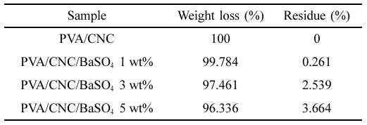 TGA: Figure 7은 PVA/CNC/BaSO4 지지체의 TGA 측정결과이다. 측정에 따른 최종 중량 감소율과 잔존율을 Table 2에 나열하였다. BaSO4 분해온도의 경우 약 1600 ℃ 부근으로 알려져 있다. 따라서 PVA/CNC/BaSO4 지지체의 BaSO4 첨가량의 증가에 따라 중량 감소율은 낮아지는 것을 확인하였으며, 이를 통해 잔존 중량에 따른 BaSO4 첨가를 확인할 수 있었다.