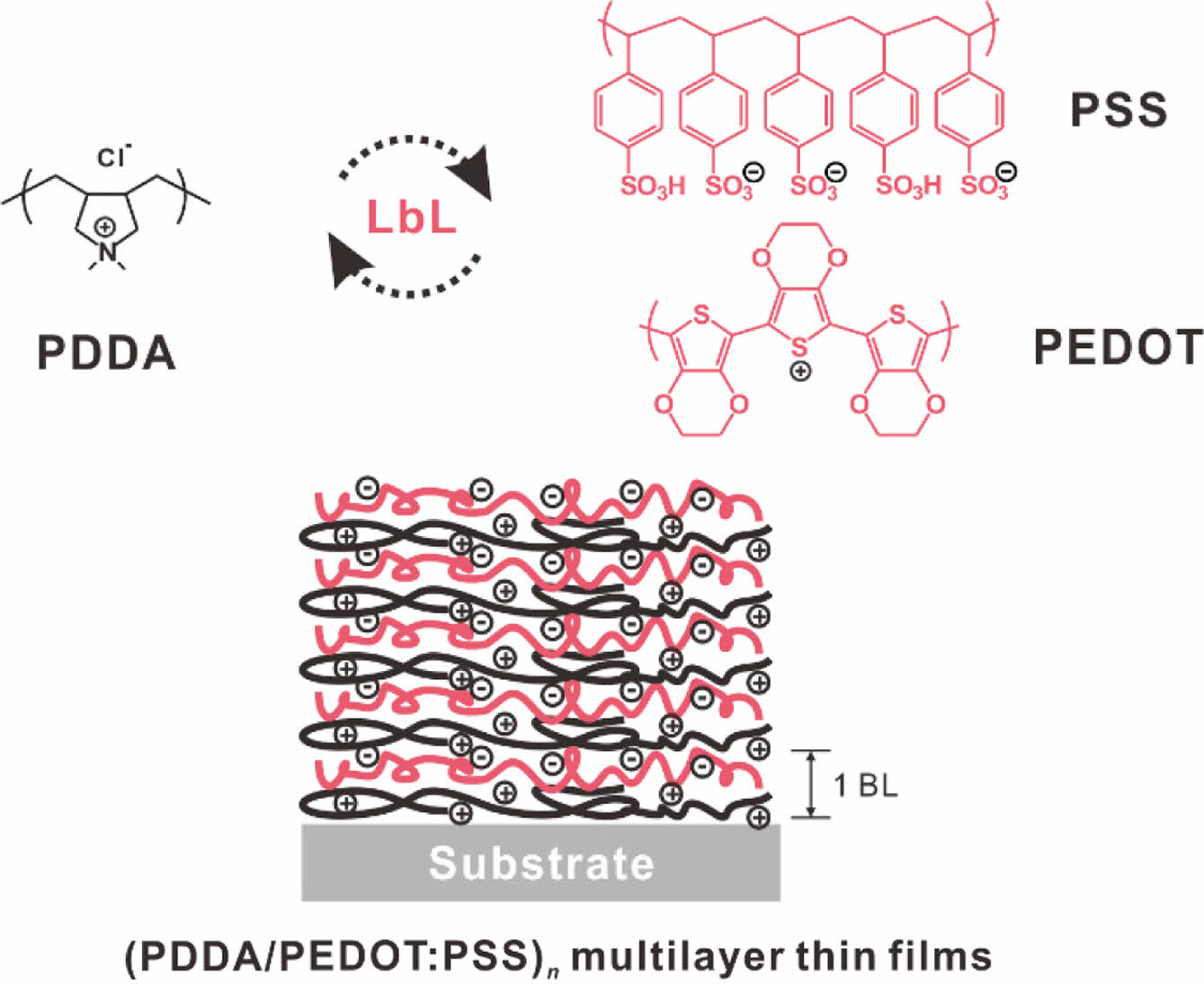 Figure 1 Polymer structure and scheme for LbL assembled multilayer thin films using PDDA and PEDOT:PSS. |