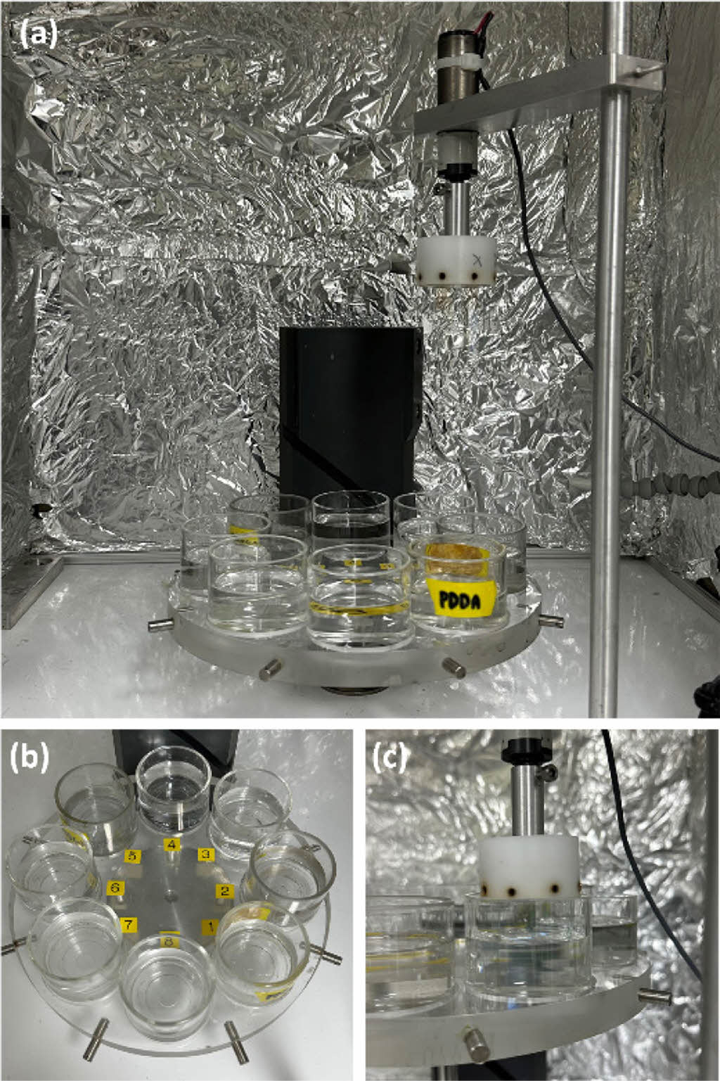 Figure 2 (a) Automated LbL machine for LbL assembly (nanoStrata); (b) (+) and (−) suspensions with rinsing solutions; (c) spin-dipping assembly |