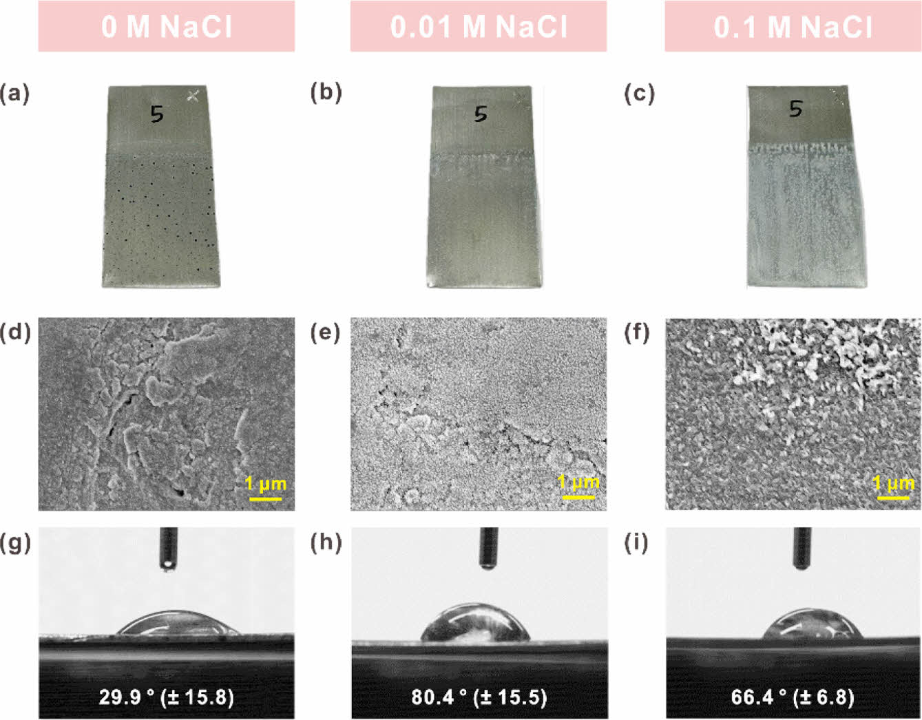 따라서 본 연구진은 고분자 사슬의 형태 변화에 따른 PDDA와 PEDOT:PSS의 다층박막필름의 영향력을 살펴보기 위하여 먼저 두 고분자 수용액의 이온의 농도를 조절하였다. 강성 고분자 전해질인 PDDA와 PEDOT:PSS는 모두 전하의 강도가 pH에 의존하지 않기 때문에 고분자 수용액의 pH 조절을 통해서는 고분자 전하 정도의 조절을 기대하기 어렵다. 따라서 고분자 수용액에 NaCl 염의 첨가를 통해 전하를 띠고 있는 고분자 사슬에 반대쪽 이온이 정전기적 인력으로 이온결합을 이루면서 전하 차폐 효과를 통해 고분자의 전하를 조절하여 다층박막을 형성하였다. PDDA 수용액과 PEDOT:PSS 수용액, 세척용 증류수를 포함한 모든 용액에 0.01 M 또는 0.10 M의 NaCl을 첨가한 후 5 BLs의 LbL 적층이 수행되었다(Figure 4). NaCl이 첨가되지 않은 경우에는 두 고분자가 부분적으로 뭉쳐서 결합된 반면(Figure 4(a)), 모든 용액에 NaCl이 첨가된 후에는 아무것도 첨가되지 않은 것에 비해서 기판 표면에 전체적으로 박막이 형성되어 비교적 균일하게 결합되었음을 육안으로도 쉽게 확인할 수 있었다(Figure 4(b), (c)). 또한 시료의 표면 SEM 사진을 통하여 NaCl이 첨가될수록 다층박막이 더 두껍게 적층되는 것이 관찰되었으며 (Figure 4(d)-(f)), 이는 고분자의 전하 차폐효과로 인해 많은 양의 고분자가 코팅되어 필름의 두께가 증가하는 것으로 LbL 다층박막적층법에서 일반적으로 관측되는 결과이다. 시료의 물 접촉각을 측정하여 형성된 박막의 친수성 및 균일도를 분석한 결과, 첨가되는 NaCl의 농도가 증가할수록 물 접촉각의 편차가 감소하여 더 균일한 박막이 형성됨을 확인할 수 있었지만 여전히 높은 편차로 균일한 필름 표면 형상을 이루지는 못하였다(Figure 4(g)-(i)).