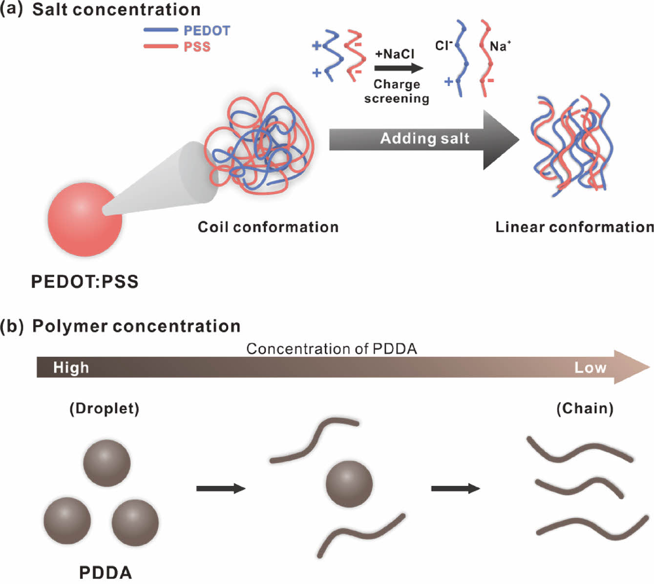 Figure 5 Schematic representation of the conformation change of (a) PEDOT:PSS; (b) PDDA as salt and polymer concentration, respectively. |