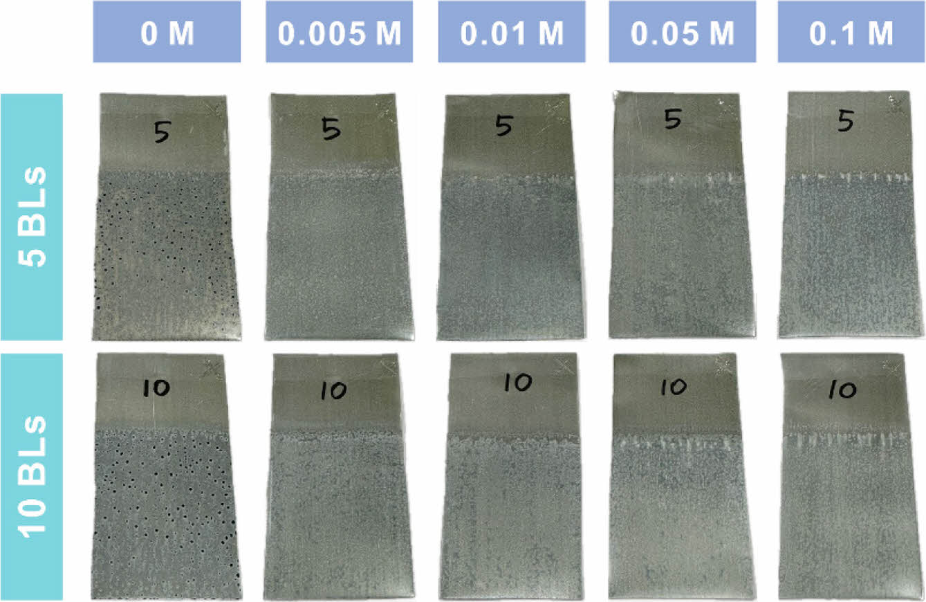 Figure 6 Photographs of LbL assembled (PDDA /PEDOT:PSS)n at 1 mg/mL and 5 mg/mL, respectively with varying concentration of NaCl (0, 0.005, 0.01, 0.05 and 0.10 M) in PEDOT:PSS solution. |