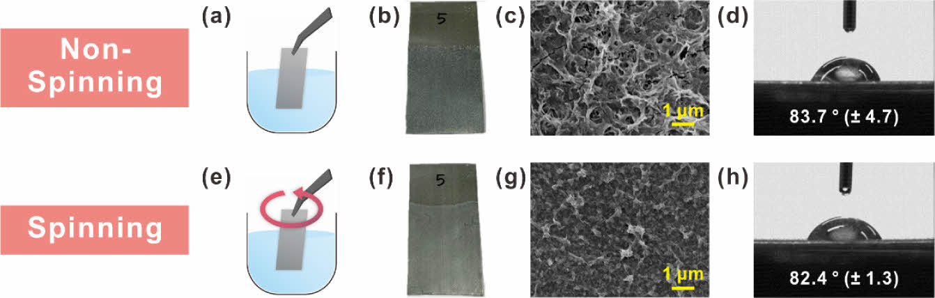 LbL 조립에 의해 적층되는 (PDDA/PEDOT:PSS) 다층박막필름의 형성 과정에서 이온의 양에 따른 전하를 조절하는 화학적인 방법을 통해 고분자 사슬 형태를 조절하는 것뿐만 아니라 물리적인 유체의 전단 응력을 통해 선형적인 고분자 사슬을 유도하고 이것이 박막 형성에도 영향을 미치는지 살펴보기 위하여 기판을 회전시키며 고분자 수용액 및 세척용 증류수에 침지하여 LbL 다층박막필름을 제작하였다(Figure 7(a), (e)). 그 결과 기판에 회전을 적용한 경우에는 용액 중에 전단 응력이 발생하여 다층박막이 더욱 조밀하게 형성되었으며(Figure 7(b), (f)), SEM 사진을 통해서 고분자들 사이의 층간 결합이 빈틈없이 균일하게 잘 이루어진 것이 확인되었다(Figure 7(c), (g)). 형성된 다층박막의 친수성과 균일도를 분석하기 위하여 시료의 물 접촉각을 측정한 결과, 물 접촉각의 평균값의 경우 같은 소재에 동일한 조정을 적용함으로 인해 큰 차이는 없었지만, 기판을 회전시킨 경우에는 코팅 면적의 물 접촉각 값의 편차가 1.3까지 감소하여 매우 균일하며 상대적으로 더욱 조밀한 박막필름 형성이 이루어졌음을 알 수 있다 (Figure 7(d), (h)).