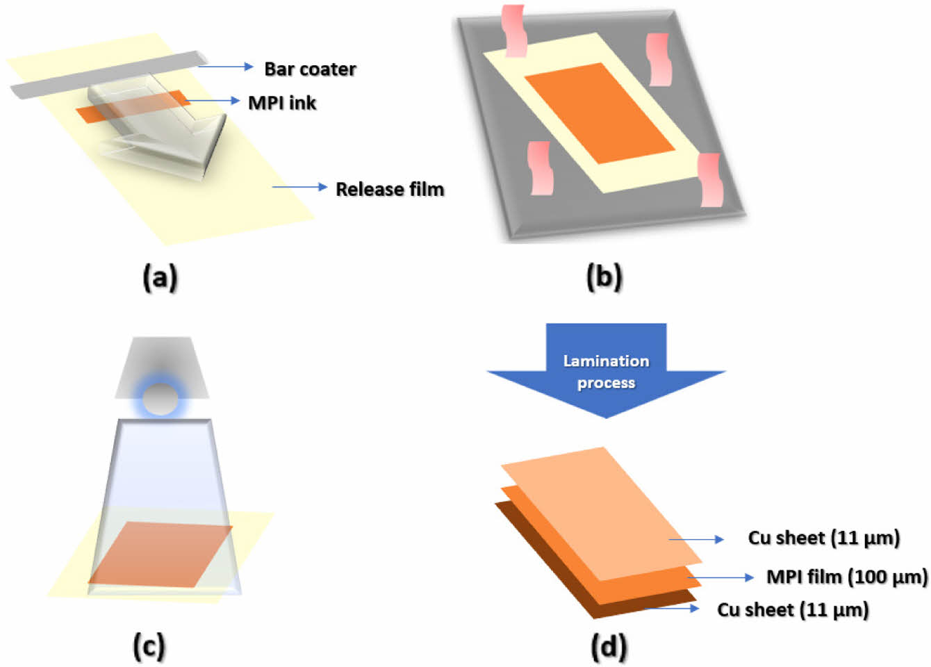 Schematic of MPI film manufacturing process: (a) coating on release film; (b) drying at 80 ℃; (c) UV treatment; (d) lamination process.
